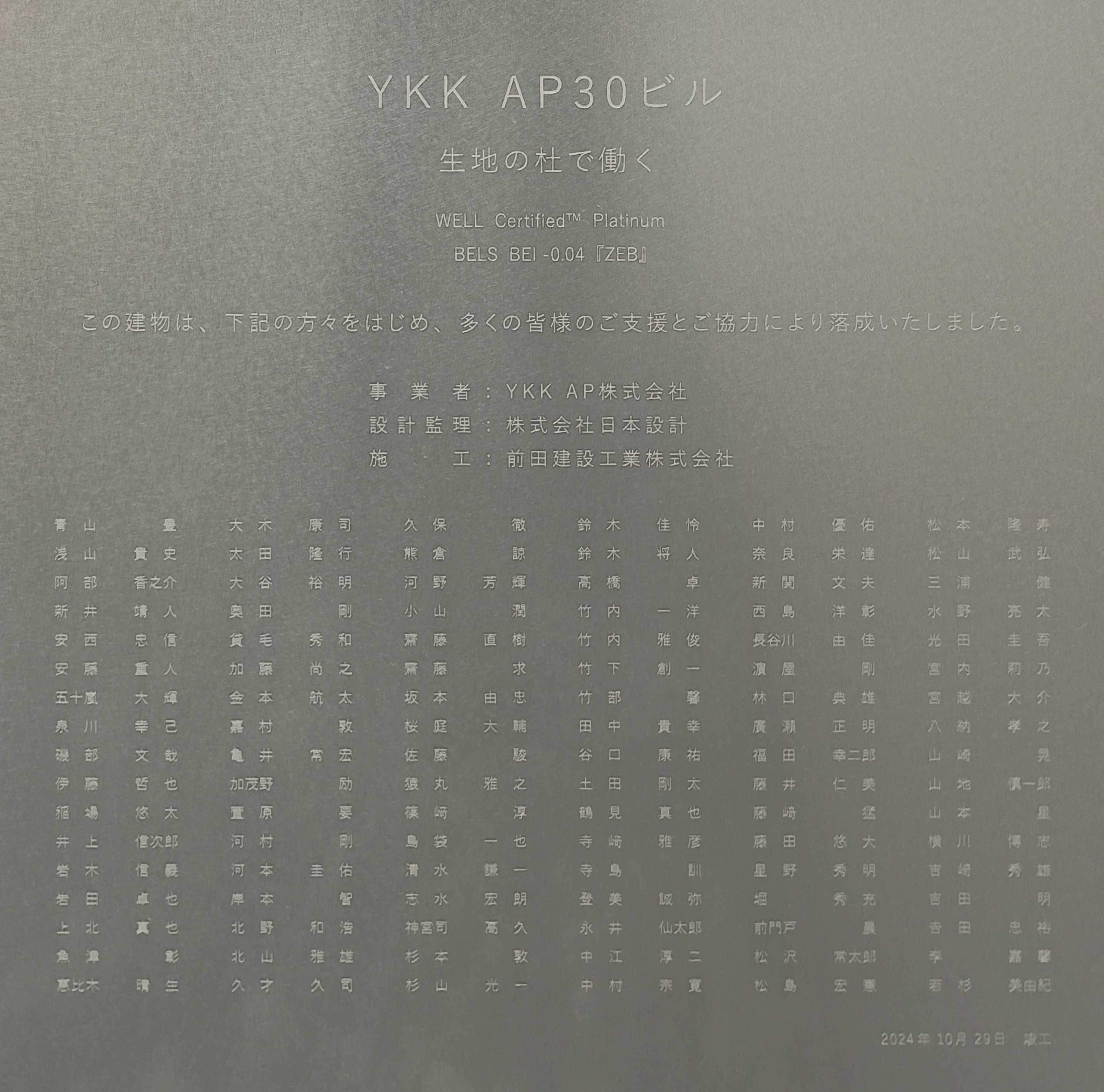 『ZEB』と「WELL認証」プラチナ、双方の認証の取得を記念して敷地内に竣工銘板を設置しました。今後もYKK APは、建築物の省エネ性能と、働く方々の快適性の向上を目指し、誰もが健康で幸せに、持続可能に暮らせる社会の実現に貢献していきます。