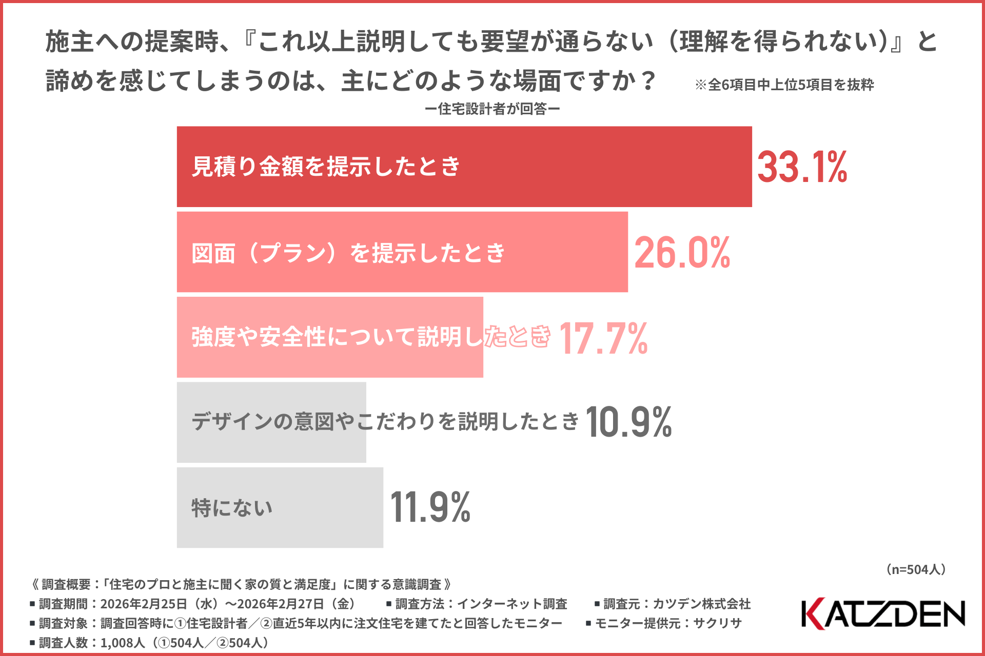 「施主への提案時、『これ以上説明しても要望が通らない(理解を得られない)』と諦めを感じてしまう場面」について尋ねたところ、『見積り金額を提示したとき(33.1%)』と回答した方が最も多く、『図面(プラン)を提示したとき(26.0%)』『強度や安全性について説明したとき(17.7%)』と続きました。