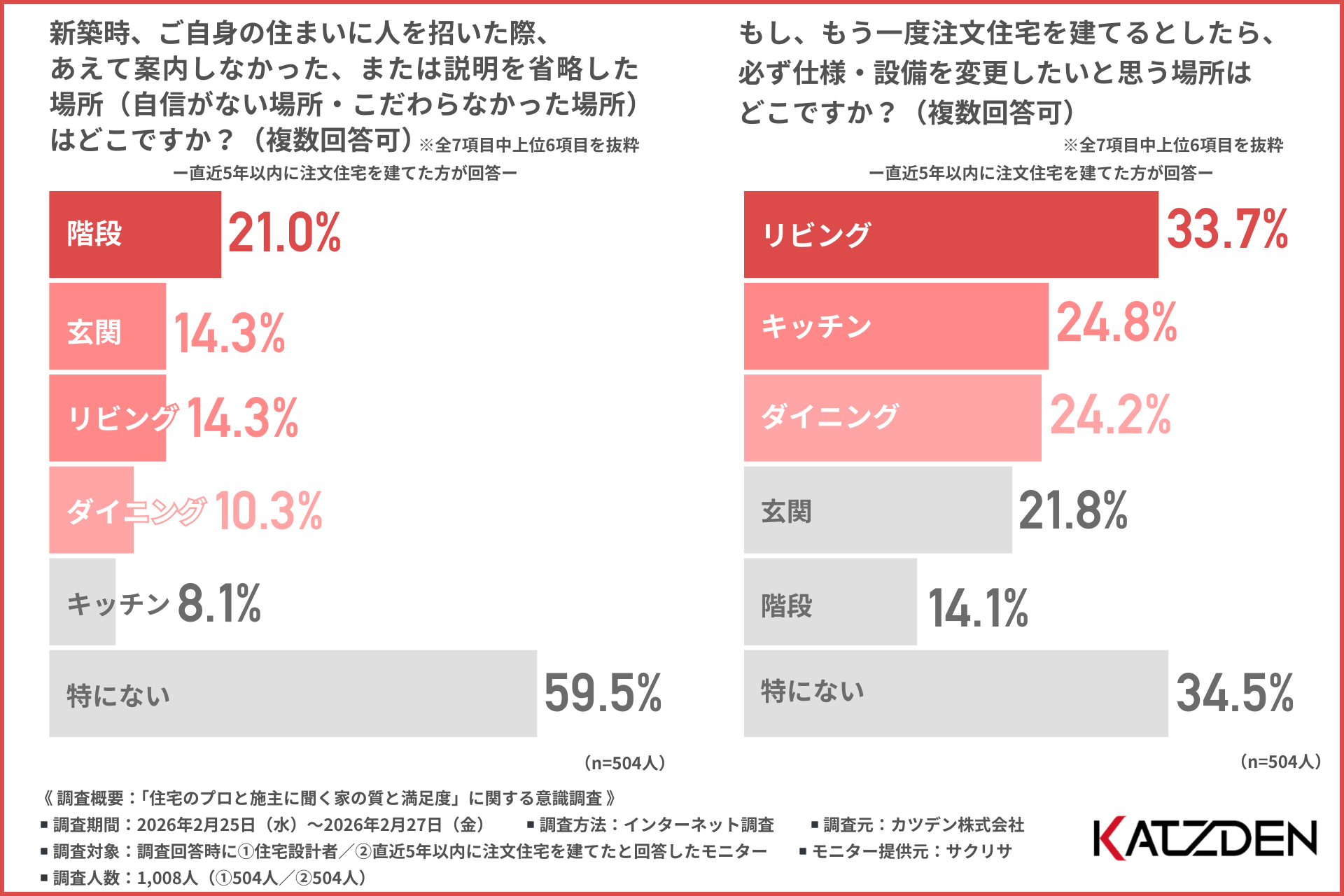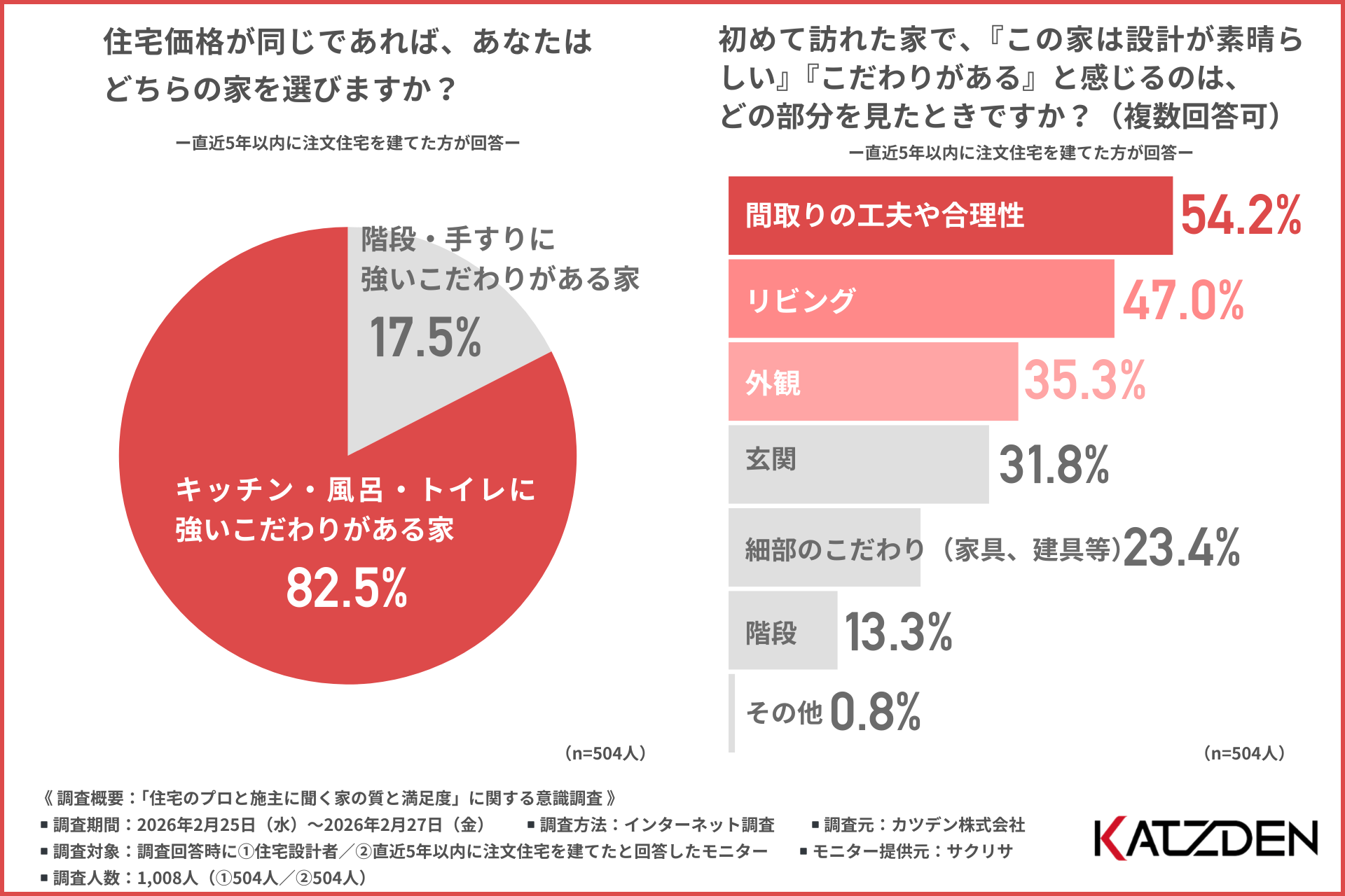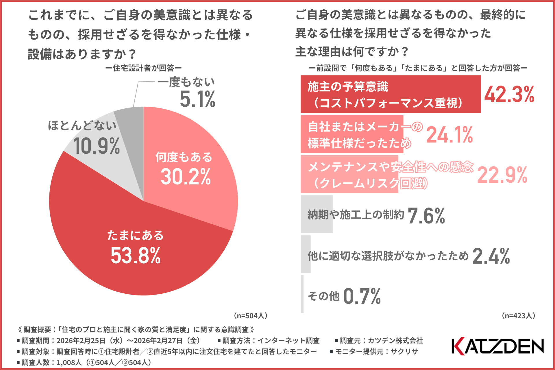 カツデン株式会社(本社所在地:東京都台東区、代表取締役:坂田 清茂)は、①住宅設計者/②直近5年以内に注文住宅を建てた方を対象に「住宅のプロと施主に聞く家の質と満足度」に関する意識調査を実施しました。