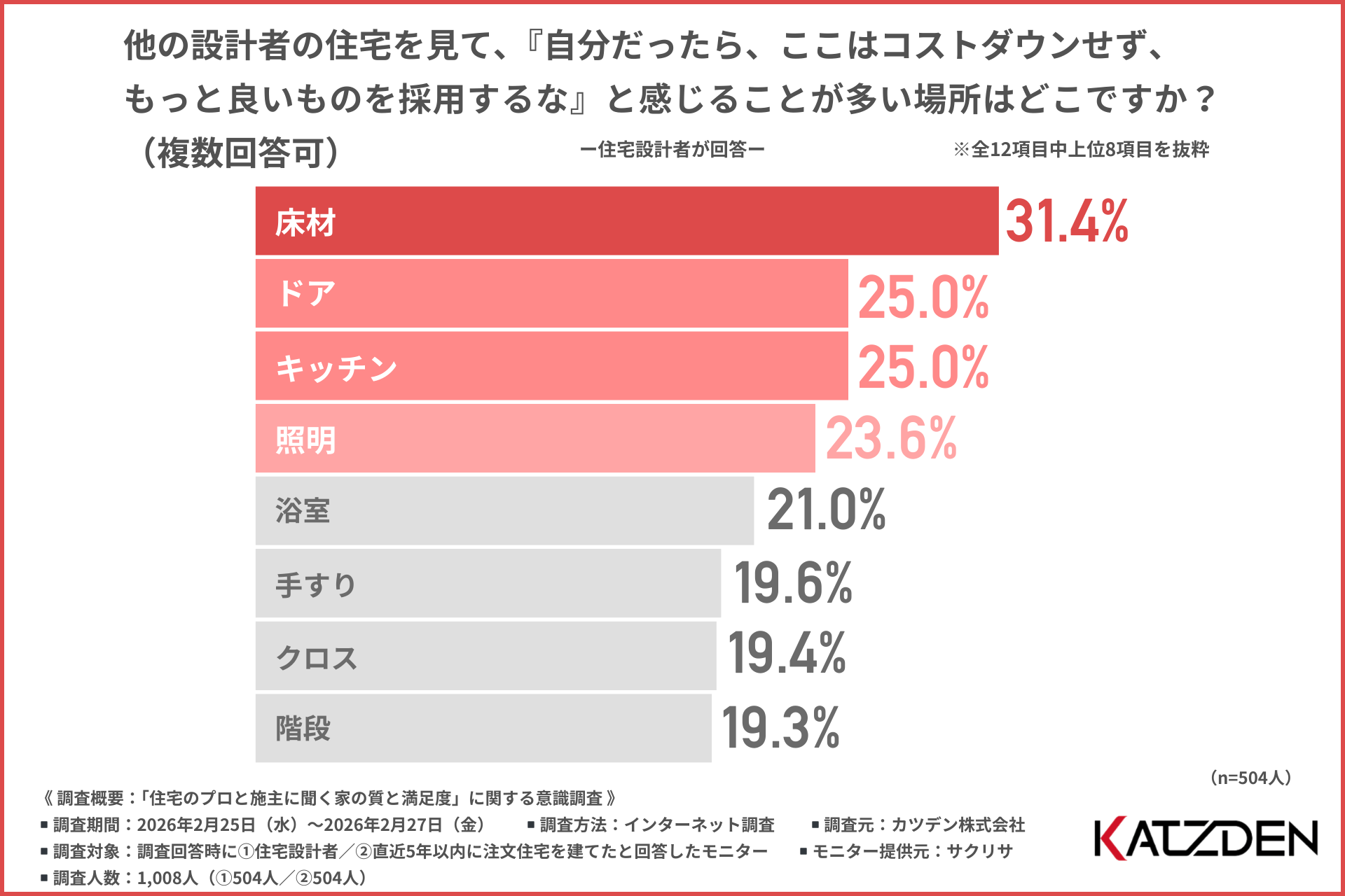 ・「カツデン株式会社が実施した『住宅のプロと施主に聞く家の質と満足度』に関する調査によると…」
