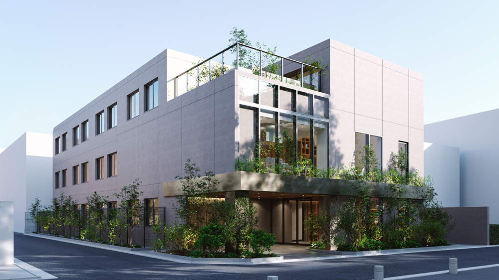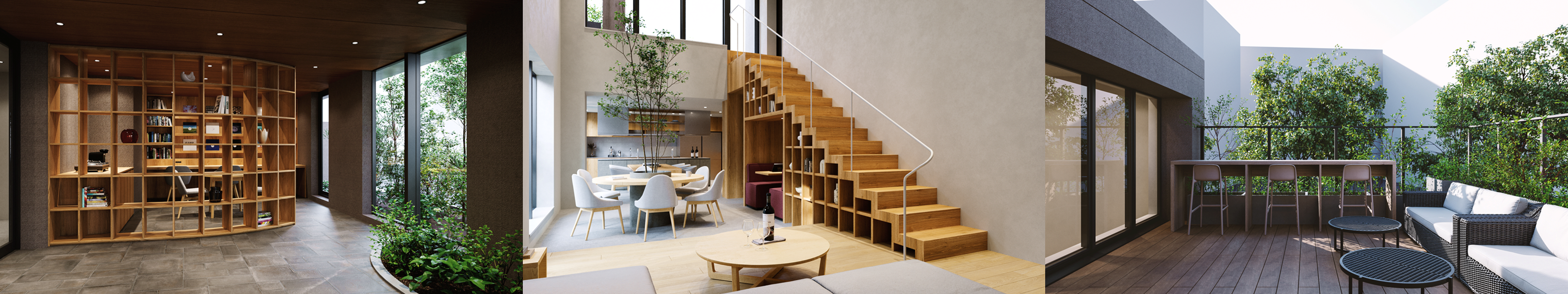 洗練されたグレーの外観に豊かな緑を組み合わせ、エントランスから屋上まで植栽を配置。自然光がたっぷり差し込む大きな窓が、明るく開放的な暮らしを演出します。