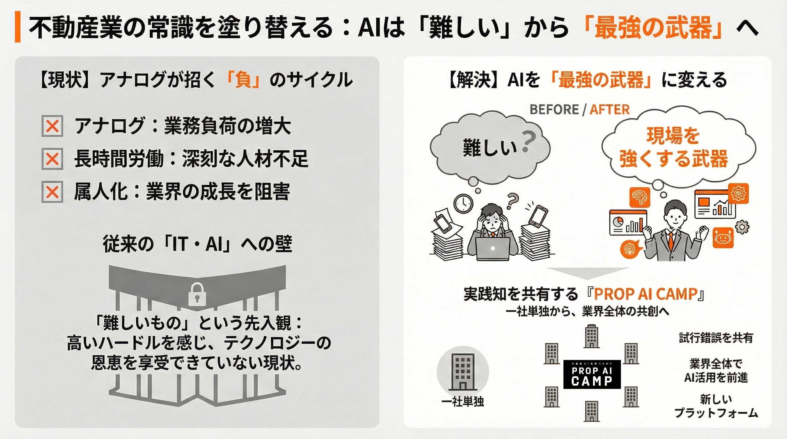クラスコグループでは、こうした環境変化に対し、「IT・AIは難しいもの」という従来の常識から脱却し、「IT・AIは現場を強くする最強の武器」として捉えることが重要だと考えています。そのためには、一社単独で試行錯誤するのではなく、業界内で実践知を共有しながら、AI活用を前進させることが必要であるとの考えから、『PROP AI CAMP』を立ち上げました。