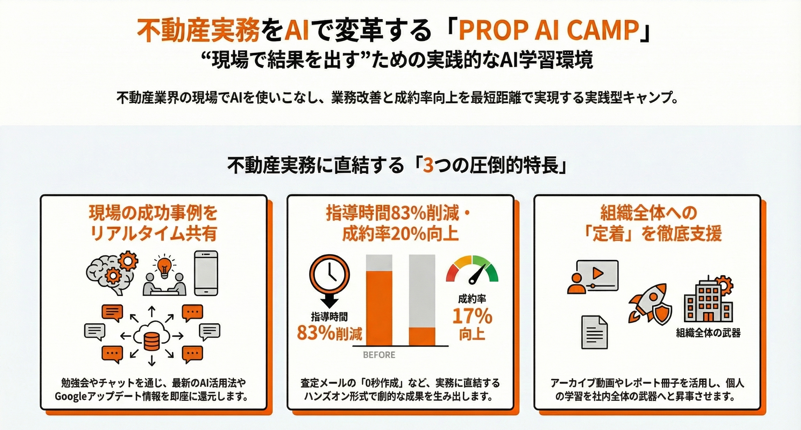 『PROP AI CAMP』は、単なる情報提供型の勉強会ではなく、不動産業界の現場でAIを使いこなすための実践環境を提供している点が特徴です。