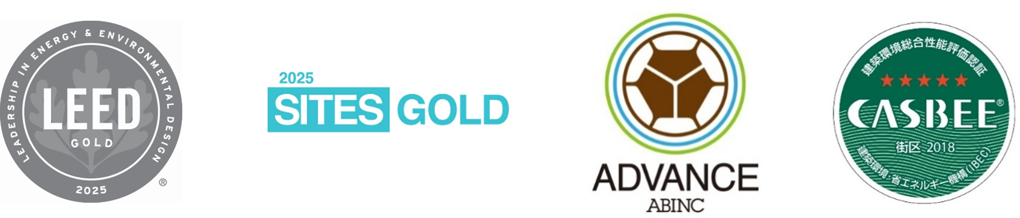 今回認証された「LEED-ND」は、複合的なエリア開発(Neighborhood Development)を評価するものです。本事業では、計画認証としてPLATINUMに次ぐGOLD認証を取得しておりましたが、予定していた工事がすべて完了したことに伴い、完成段階を対象とする「Built Project」においてもGOLD認証を取得いたしました。