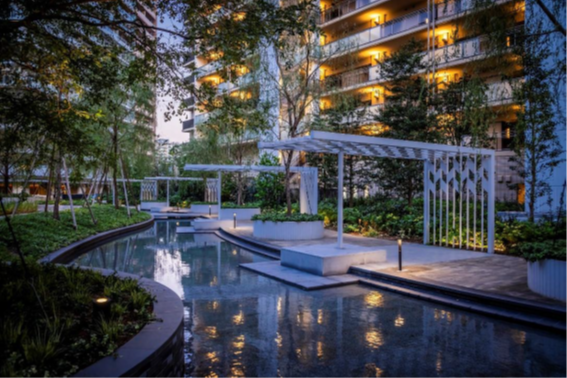 外構計画では緑地の1回当たりの灌水量と水景保有水量が極力同じになるように水景をデザインすることで、水景の水質維持・上水使用量と水景メンテナンス費の低減が可能となる「ハイブリッド水景・灌水システム」を採用しました。こういった取り組みは、ABINC ADVANCEやSITESの理念に沿った内容となっています。