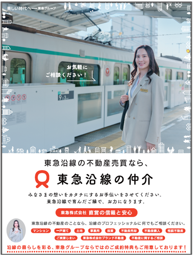 東急沿線の仲介では、当社がこれまでのまちづくりを通じて培ってきた沿線の皆さまとの繋がりや信頼をもとに、地元との連携を一層深めるとともに、さまざまな分野での事業を通じて当社ならではの付加価値を提供し、「未来に向けた美しい生活環境の創造」および「事業を通じた継続的な社会課題の解決」に取り組んでいきます。そして「魅力的で、持続可能なまちづくり」を実現し、選ばれ続ける東急線沿線を目指します。