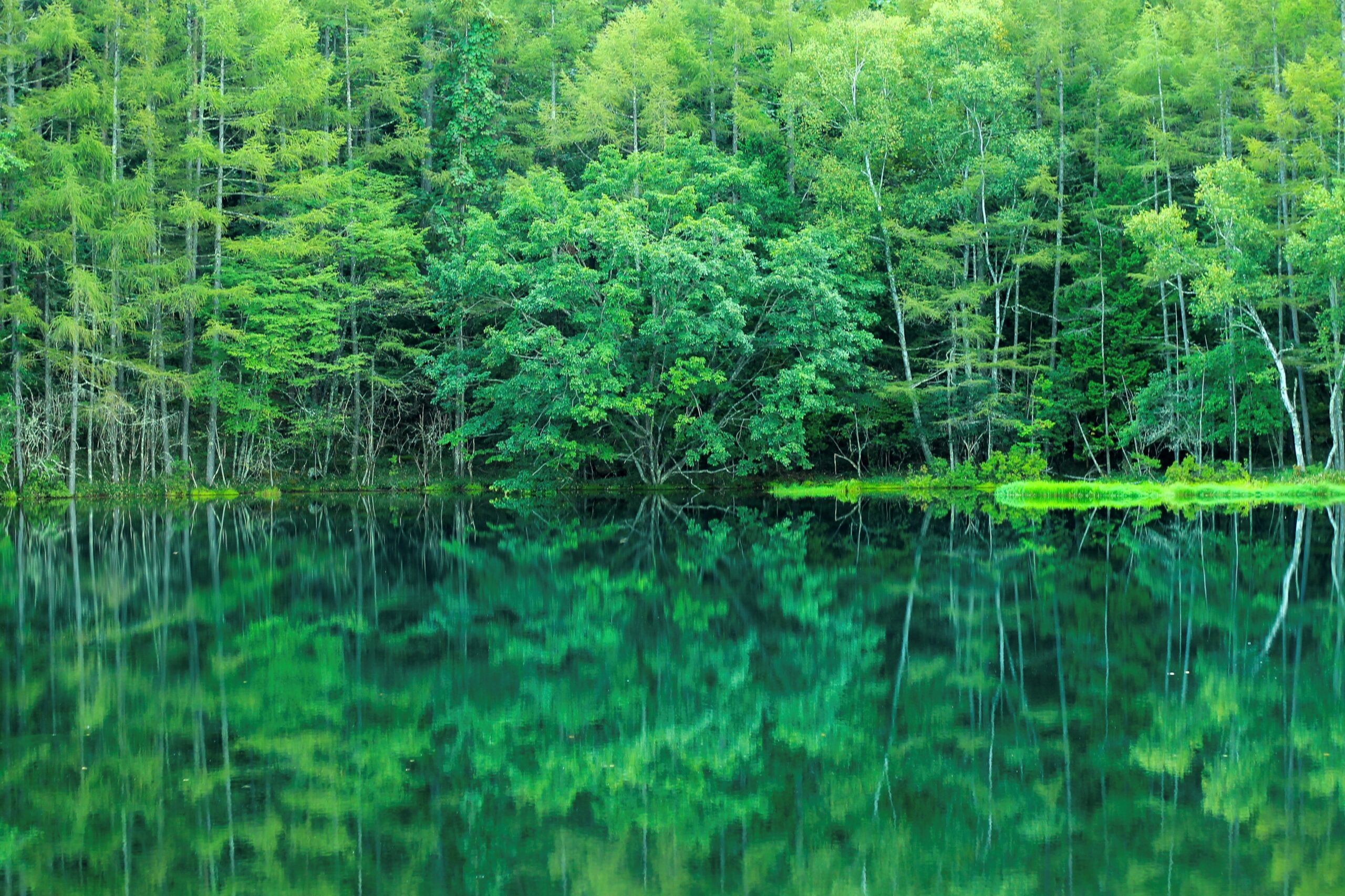 水面に映った緑の木々がまるで絵に描いたような美しさです。写真全体がグリーンで敷き詰められており、とても印象的な1シーンだと思います。