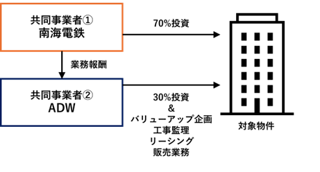 強固な資本力を有する南海電鉄との共同投資スキームによって、ADWは「50億円超規模の大型不動産」の市場への参入を、自社単独で行うよりもさらに安定的に推進することができます。これにより、当社グループのバランスシートへの負担を低減しながら収益獲得機会の最大化を図るとともに、当社の強みである「不動産の目利き力・ソーシング力」、「購入後の不動産価値向上力」及び「長期運用ノウハウ」をノンアセットビジネス領域へと拡張することを目指します。