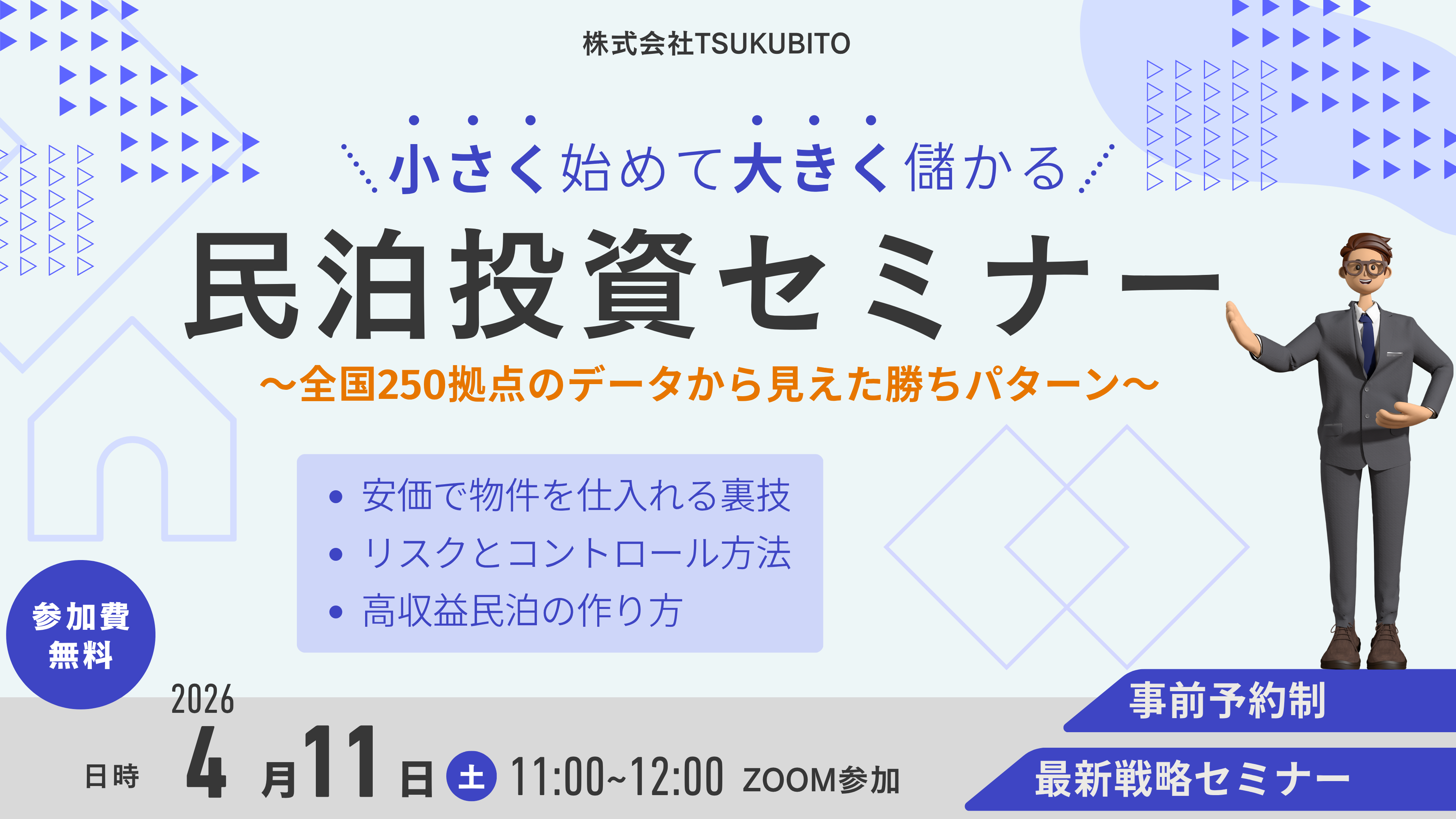 民泊投資を始めたい方・収益を伸ばしたい方向けに、「小さく始めて大きく儲かる 民泊投資セミナー」を開催いたします。全国250拠点の運用データをもとに、実際に成果が出ている“勝ちパターン”を具体的に解説。