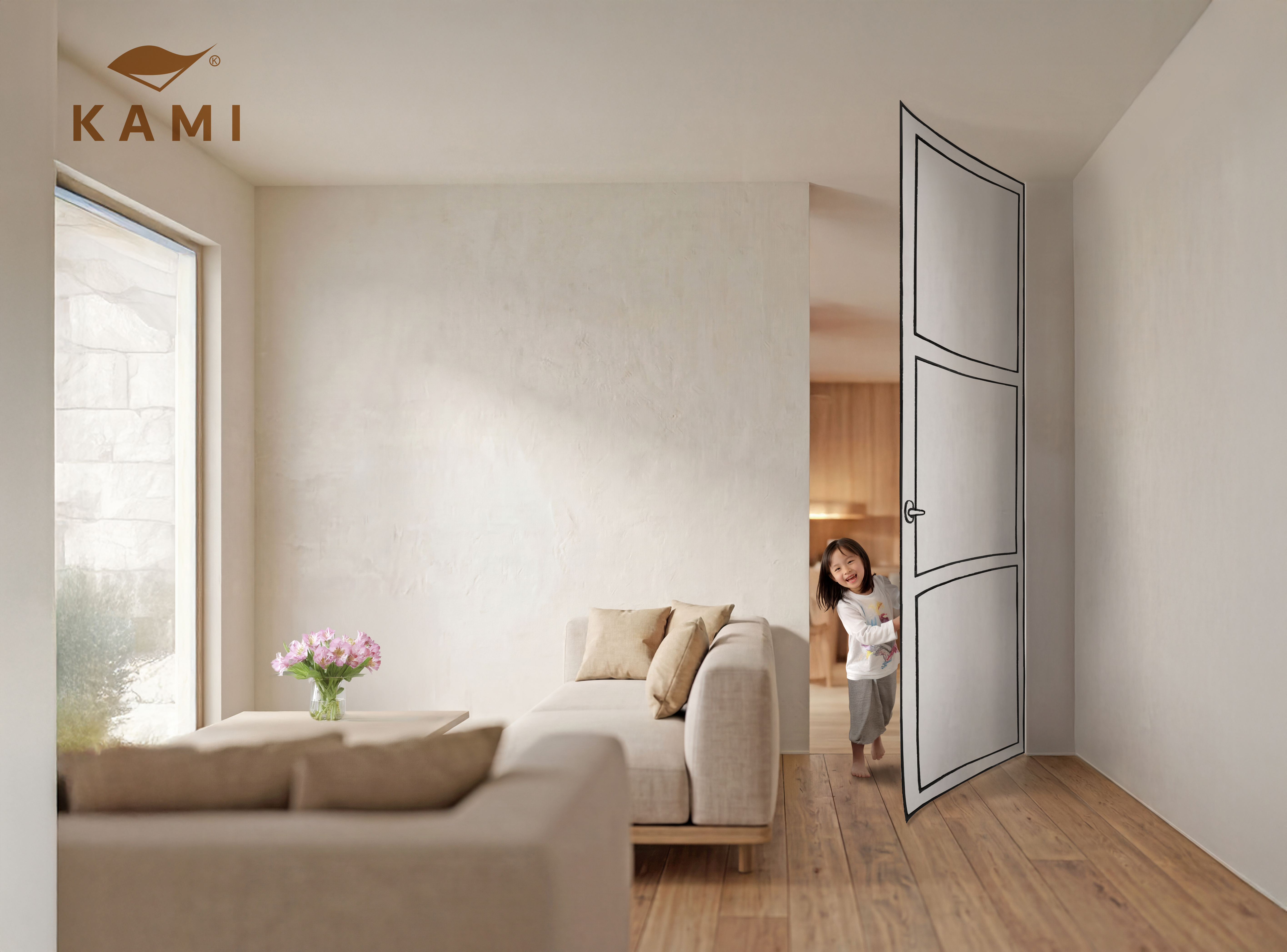 遮音機能をなくし究極のミニマルスタイルを実現したKAMIは、室内外の会話はほぼ丸聞こえ。プライバシーという壁を取り払い、家族のコミュニケーションをアクティベート。