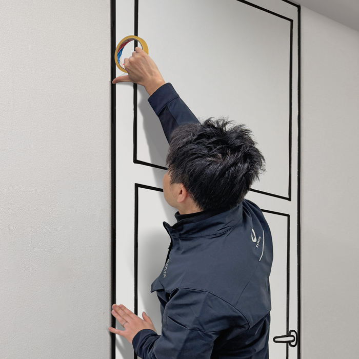 特殊ポリマー粘着層を備えた透明被膜を、ドア枠に 圧着するだけで取付が完了する超低コスト施工。