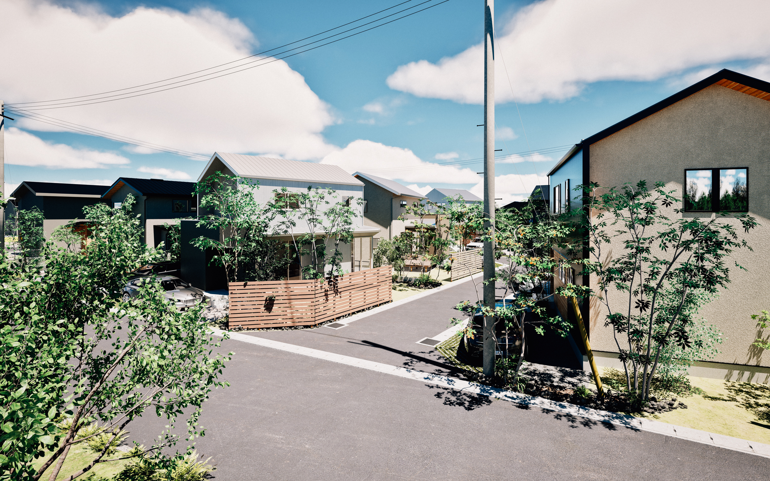 施工の合理化とクリエイティブな提案を生み出すために、プロの知見で「仕様の標準化」や「厳格な設計ルール」を定めます。また、居住空間を庭へ拡張し、多様なシーンを創出。「家の外への意識」が自然な交流と「顔の見える関係」を生み、地域の防犯・互助機能を高めます。