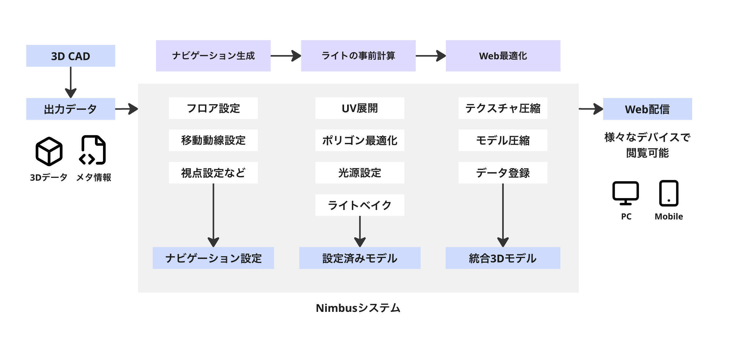 本技術は、技術者が手作業で行っていたVR化工程を、CADメタデータの解析によってシステム化したものです。独自システム「Nimbus(ニンバス)」により、制作工程の自律化と省人化を推進。人的ボトルネックを排除したことで、クラウドによる並列処理を可能にし、「全棟VR化」を支える空間のデジタルインフラ構築を加速させます。