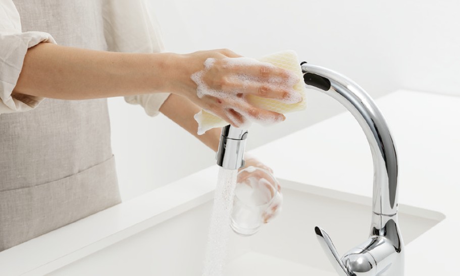 蛇口の側面にセンサーを配置することで、腕を大きく持ち上げたりひねったりする動作を抑え、自然な姿勢で操作できます。あわせて、手をかざした際に水や洗剤が水栓に垂れにくく、水仕事後の拭き取りの手間を軽減し、清潔な状態を保ちやすくします。