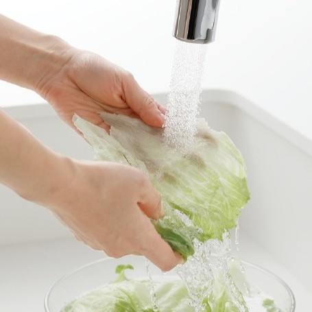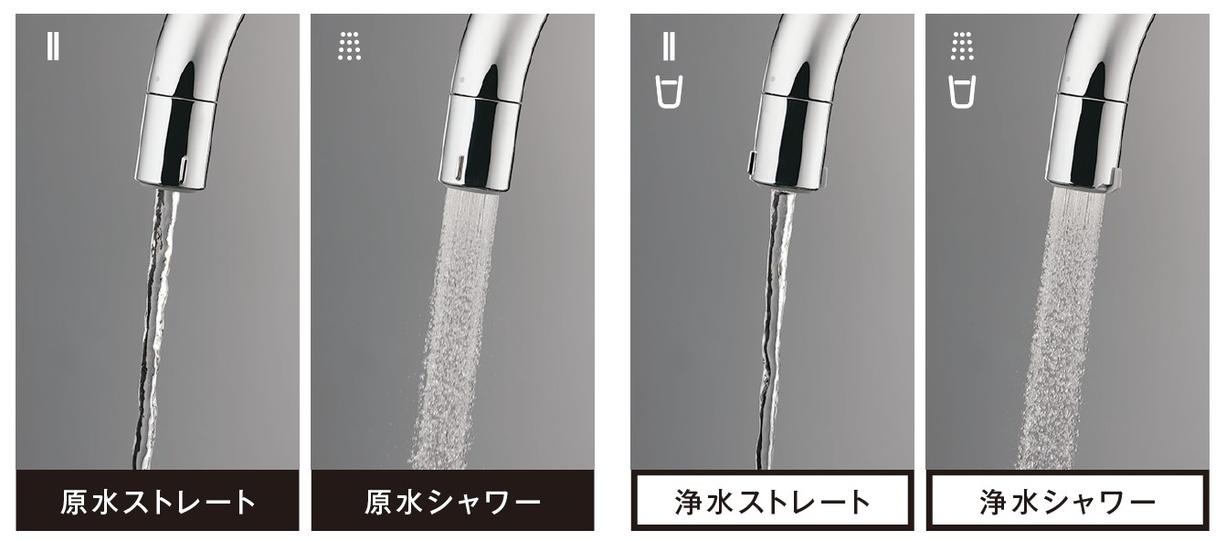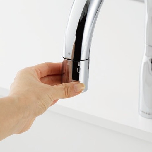 用途に応じて4つの水形を使い分け可能。浄水シャワーは塩素を除去するため、野菜洗いや米とぎなどの下ごしらえにも適しています。蛇口先端のダイヤルを回すだけで水形と浄水・原水の切り替えができ、タッチレスでありながら複雑な操作を覚える必要はありません。