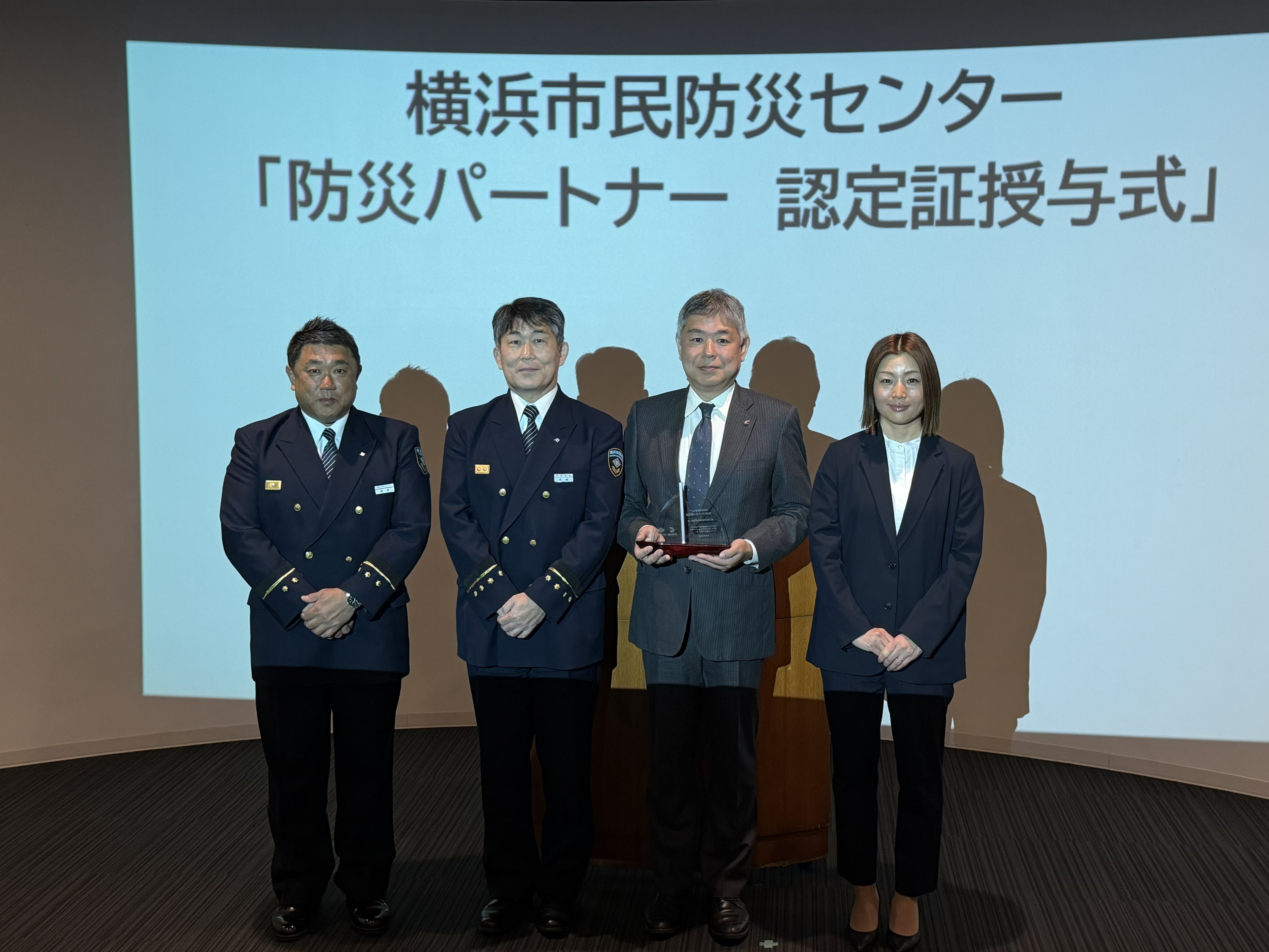 横浜市民防災センターの運営理念に賛同し、企業の経験や技術を活かして体験エリアのコンテンツの全部または一部を作成し、かつ、完成物を横浜市民防災センターが施設運営のために無償で提供する企業のことです。なお、当社は令和8年1月30日に横浜市民防災センター広告付き煙体験エリアの改修に関する協定を締結しています。同年3月23日、「防災パートナー認定証授与式」が実施されました。