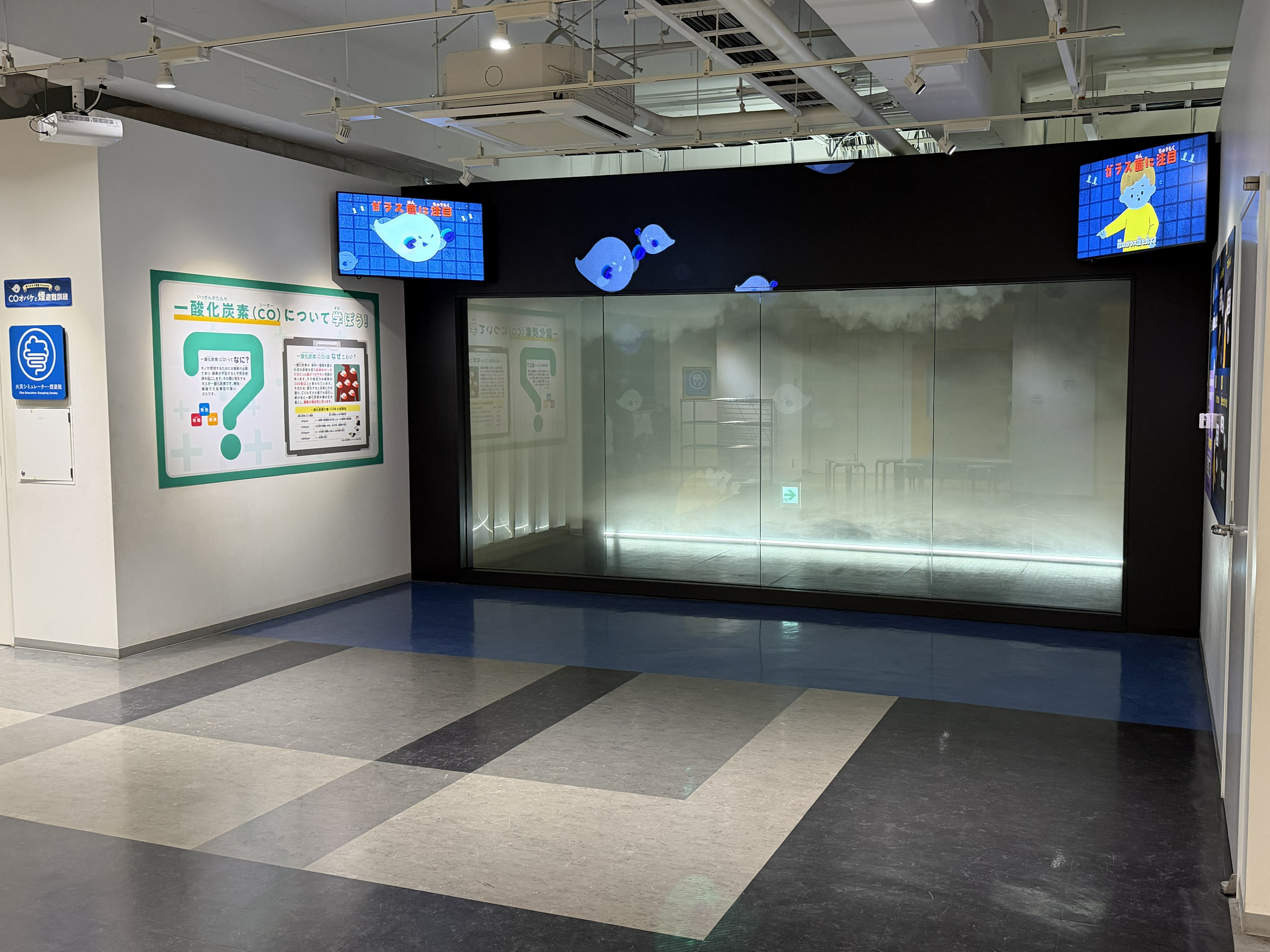 概要:従来の煙体験コーナーのスペースにて、動画・プロジェクター・パネルを使って、「火災時の一酸化炭素の危険性」や「正しい避難方法」について気づきや知識を与え、その後の『煙の中の避難』という体験をより学びが深いものにします。