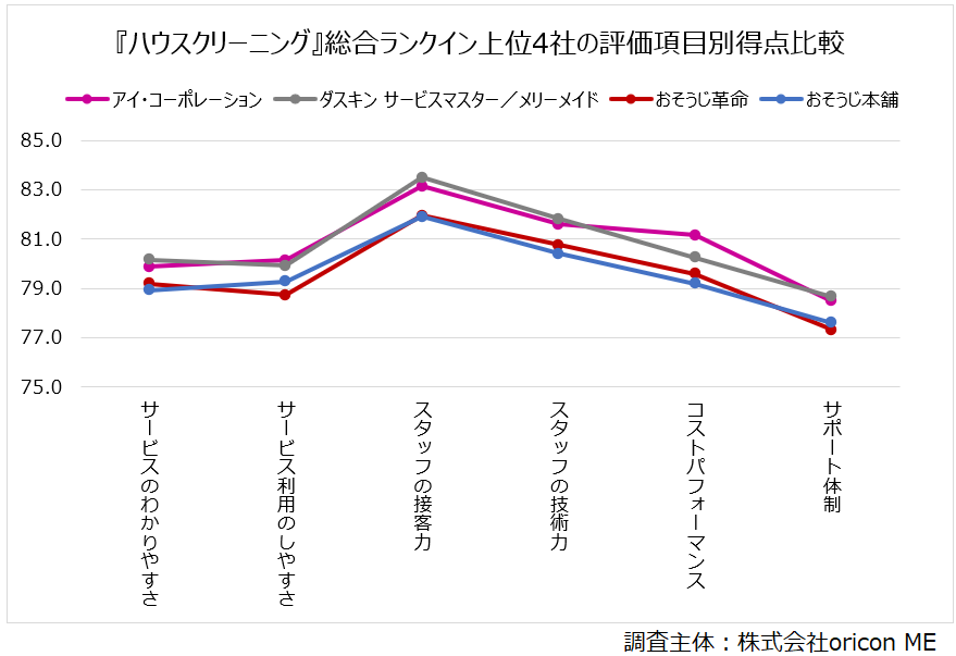 『ハウスクリーニング』総合ランクイン上位4社の評価項目別得点比較表(オリコン顧客満足度Ⓡ調査)