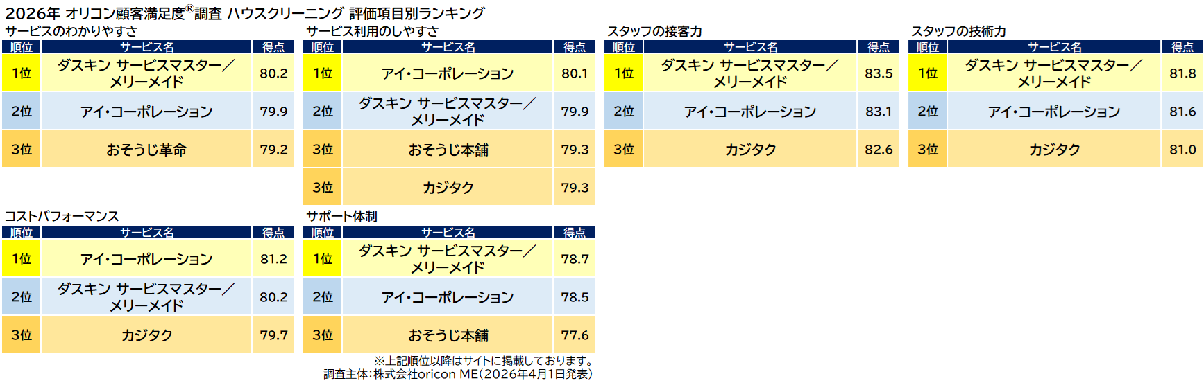 『ハウスクリーニング』評価項目別ランキング(オリコン顧客満足度Ⓡ調査)