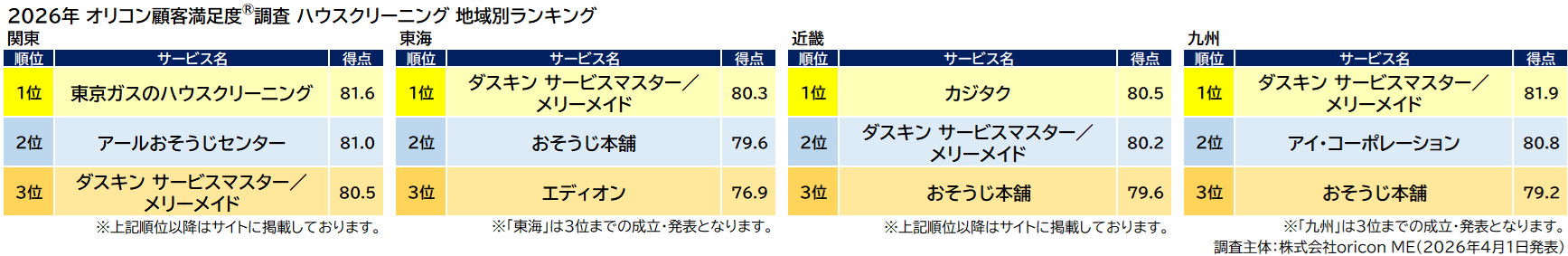 『ハウスクリーニング』地域別ランキング(オリコン顧客満足度Ⓡ調査)