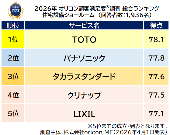 満足度の高い『住宅設備ショールーム』ランキング┃総合1位は【TOTO】、総合2位は【パナソニック】、総合3位は【タカラスタンダード】(オリコン顧客満足度調査)