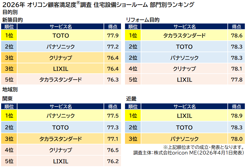 『住宅設備ショールーム』部門別ランキング(2026年 オリコン顧客満足度®調査)