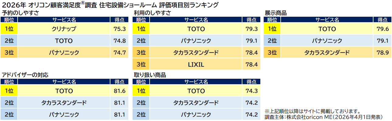 『住宅設備ショールーム』評価項目別ランキング(2026年 オリコン顧客満足度®調査)
