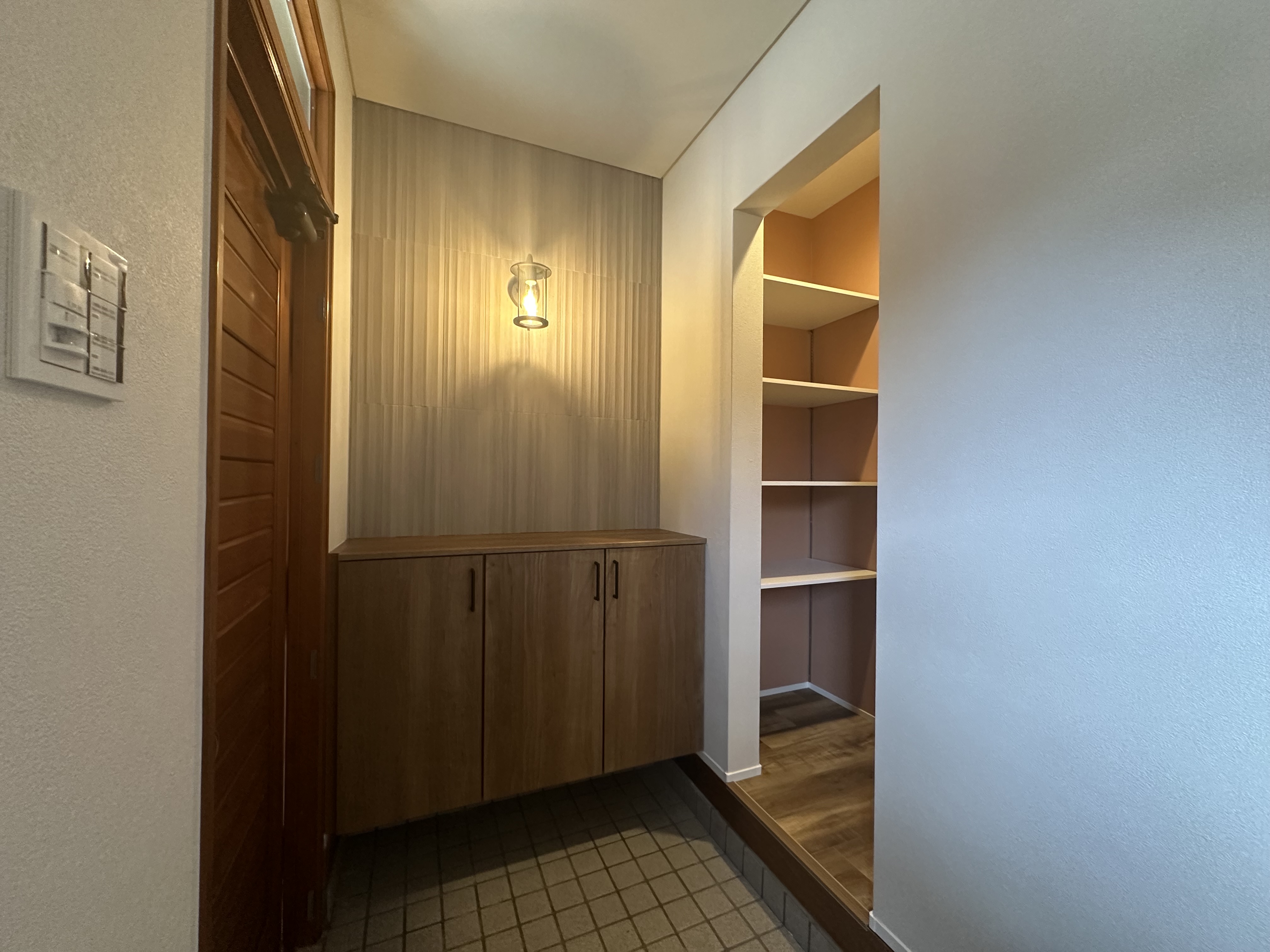 古い下駄箱で収納量が不足。光が届きにくく暗く見える玄関の壁を打ち抜いて、大容量の玄関収納を新設。照明