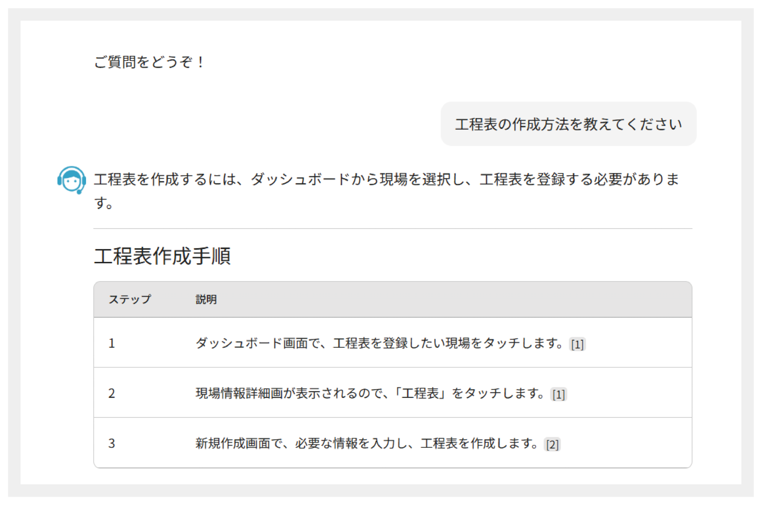 現場Plusの画面から直接AIに質問し、その場で回答を確認できます。問い合わせや確認にかかる手間が削減されることで、施工管理の判断と次の行動をスムーズに進められるようにします。