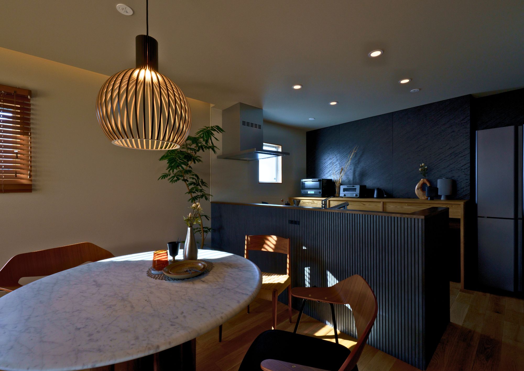 建物には、田部家の社有林の木や島根県産材を構造材として使用し、無垢材や塗り壁などの自然素材を随所に採用しました。五感にやさしく響く空間とし、動線計画や収納、光と風の取り入れ方まで丁寧に設計することで、日々の家事や暮らしの流れが自然と整う住まいとなっています。