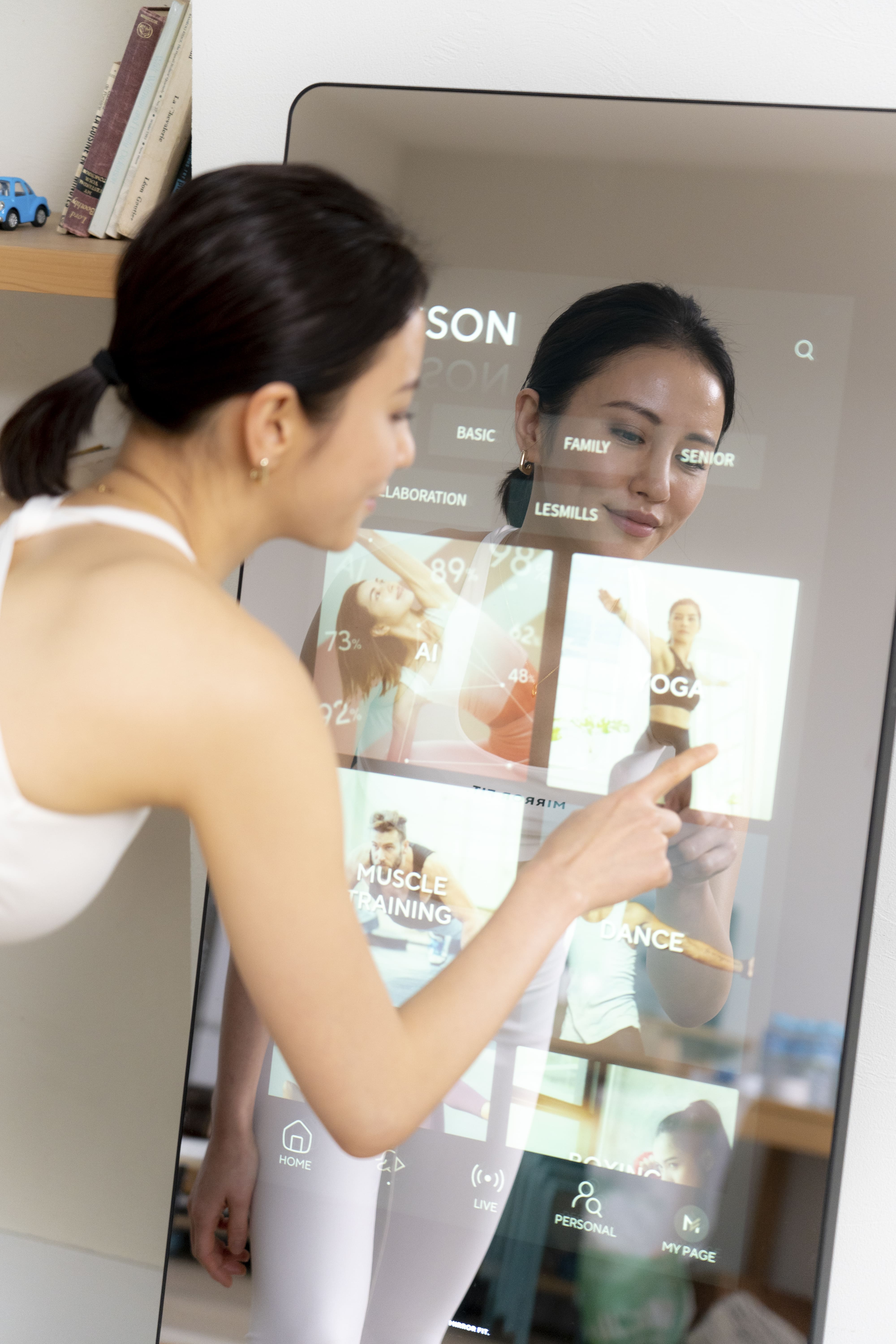 普段は鏡として使用し、トレーニング時にコンテンツを表示することで、日常生活とフィットネスをシームレスに融合します。