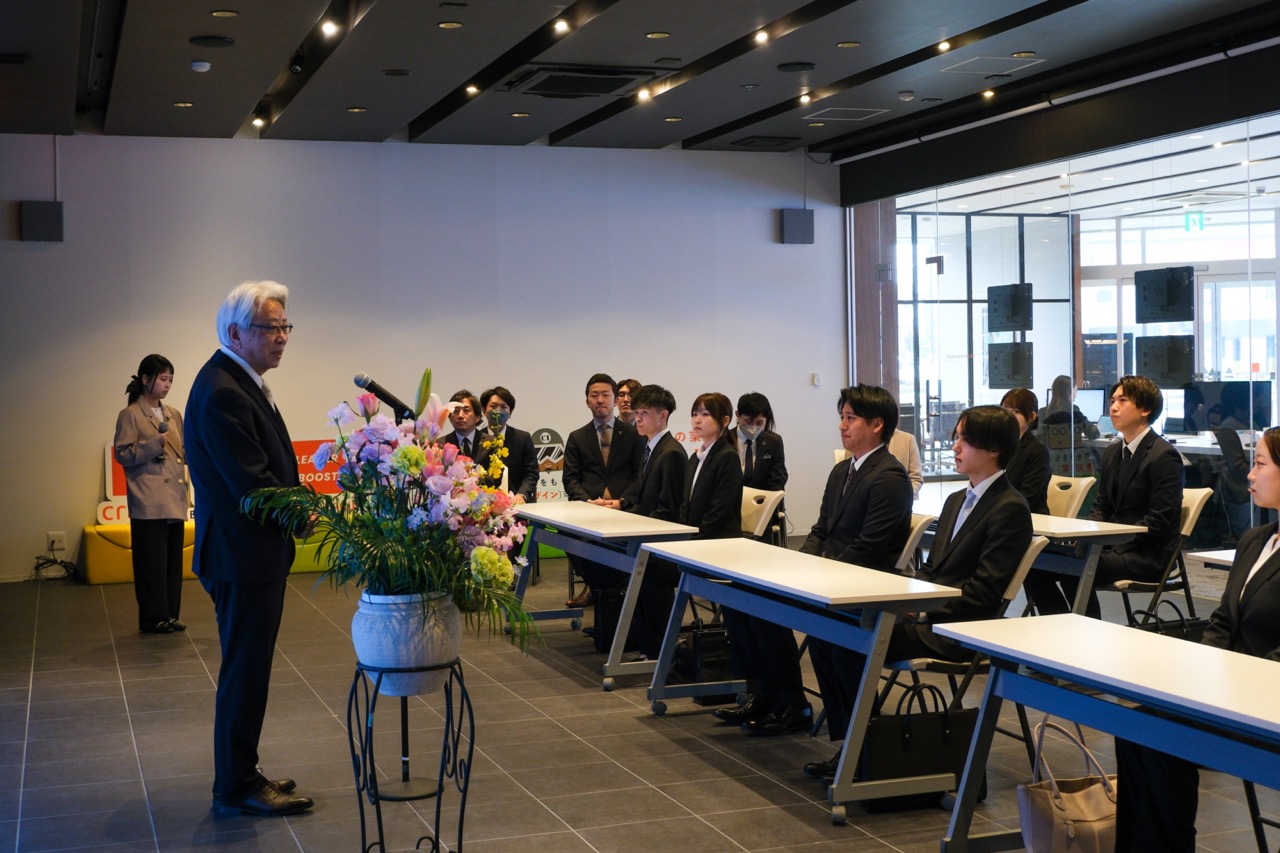 「今は失敗しても許される時期です。私たち先輩社員一同が全力でサポートします。失敗を恐れず、前向きに、自分の成長や初めての体験を楽しんでください」と語り、完璧を求めて立ち止まるのではなく、まず一歩踏み出し、現場で経験を重ねることの大切さを伝えました。