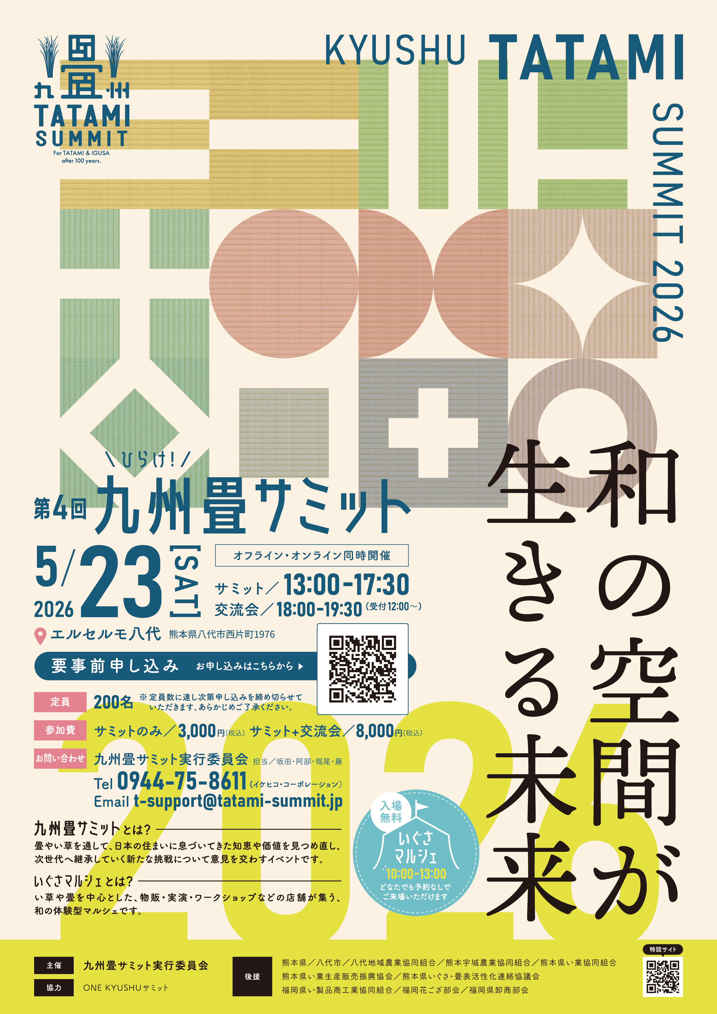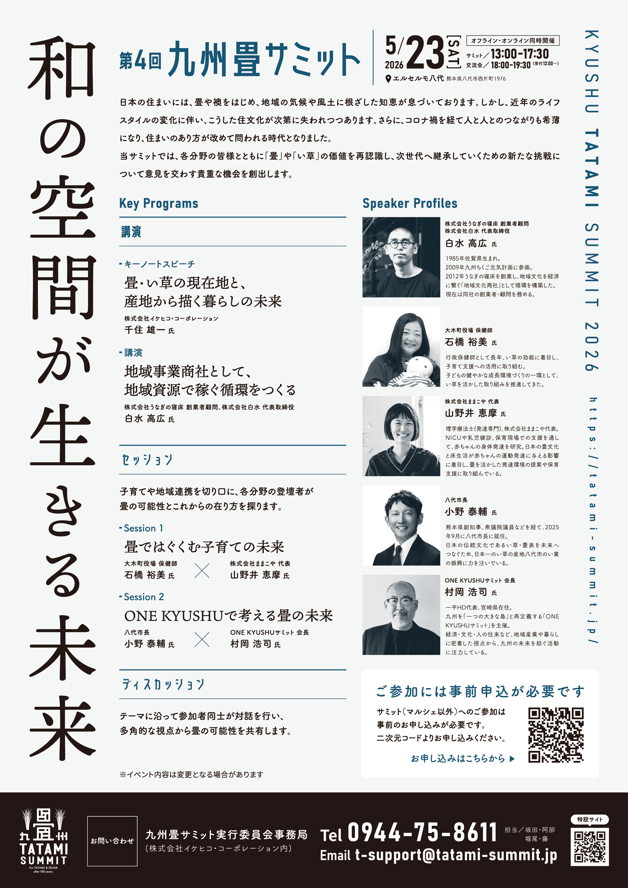 九州畳サミット実行委員会(実行委員長:株式会社イケヒコ・コーポレーション 代表取締役 猪口耕成)は、2026年5月23日(土)に「第4回 九州畳サミット」を、い草の一大産地である熊本県八代市にて開催いたします。ライフスタイルの変化などによりい草の作付面積がこの30年でピーク時の約1/30以下にまで減少する中、今、産地と暮らしをどうつなぎ直すかが問われています。畳やい草は、くつろぎや家族の時間を支えてきた日本の暮らしの原風景ともいえる存在です。本サミットでは、い草生産者や畳店、建築、行政、文化関係者など多様な立場の関係者が集い、その価値とこれからの可能性を見つめ直すとともに、一般生活者にも開かれた場として、講演やワークショップ、体験型マルシェを通じて和の空間の未来を発信します。