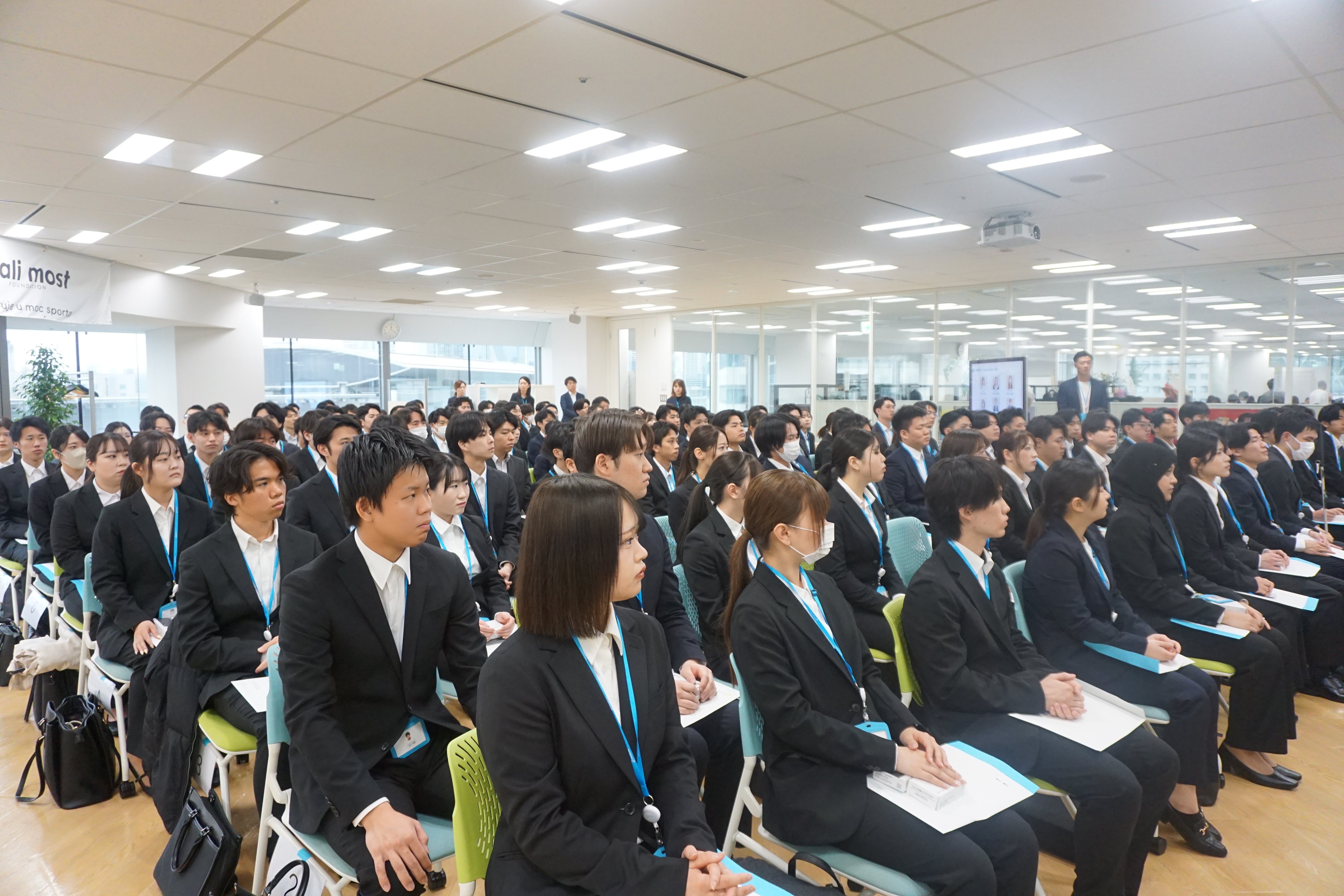 序盤は緊張した様子が見られた新入社員でしたが、先輩社員が会場に駆けつけ、「日々コツコツと努力を積み重ねることが成果につながる」「決して一人ではなく、周囲の仲間と支え合いながら成長していける」といった力強い言葉や、「お客様のことを第一に考えた先に、自分の成長や評価がついてくる」という想いが届けられると、徐々に表情も和らいでいきました。会場の雰囲気も次第に温まり、先輩社員から新入社員へと想いが引き継がれる中で、これから始まる社会人生活への期待が一気に高まりました。