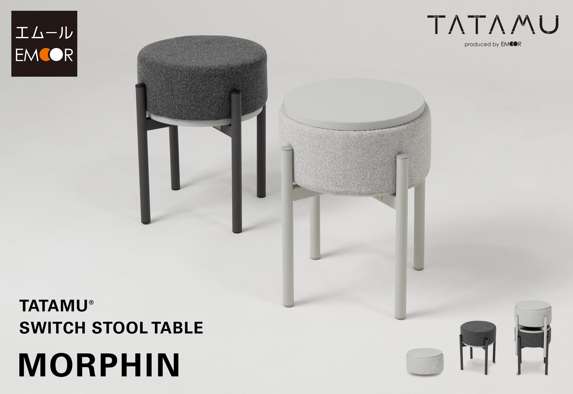 人間工学に基づいた空間有用性と安全な使い心地を両立するトランスフォーム家具ブランドTATAMUⓇを展開する株式会社エムール(東京都立川市:代表取締役 高橋 幸司)は、2026年4月2日より、スタッキングできるスツール&テーブル「MORPHIN(モーフィン)」(以下、モーフィン)の販売を開始しました。