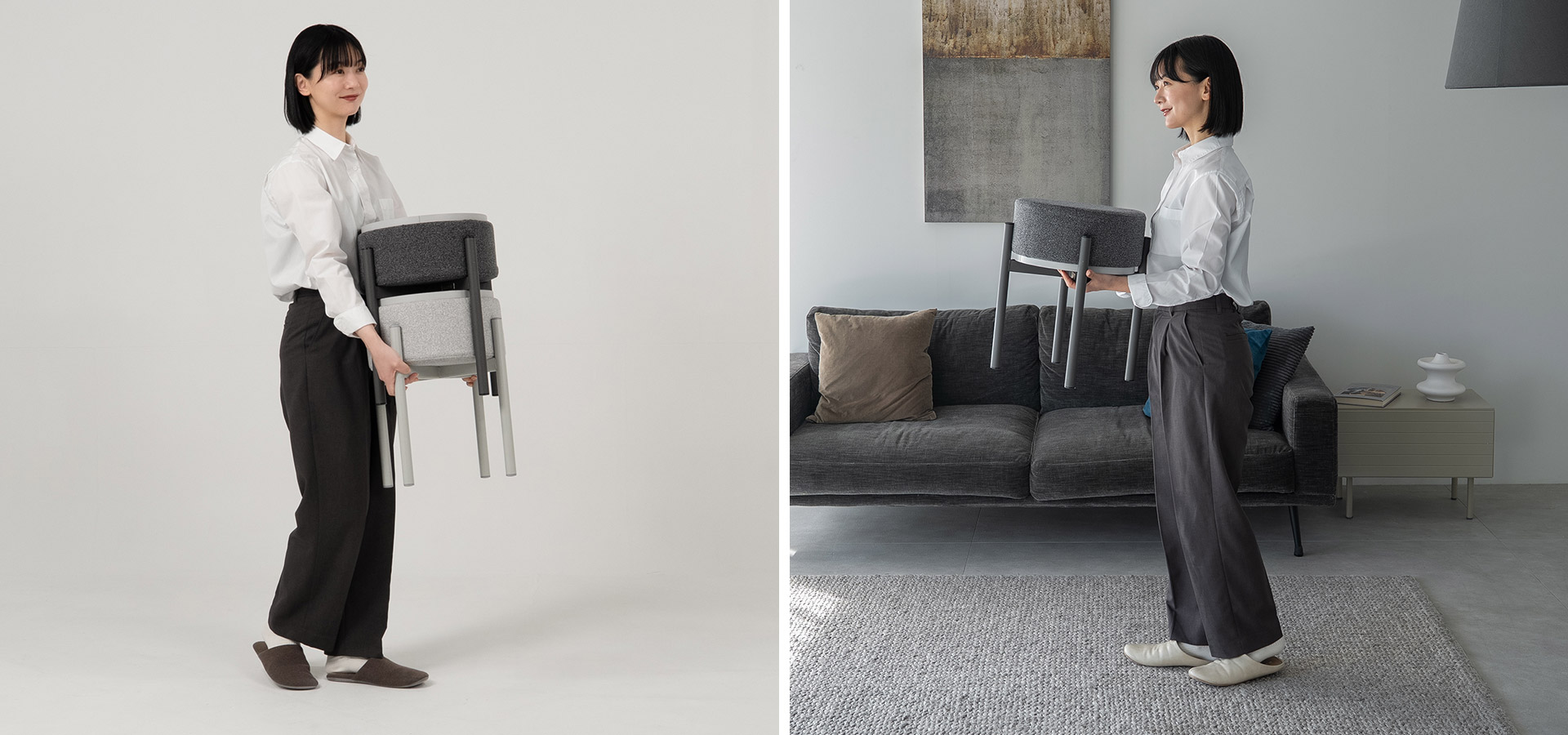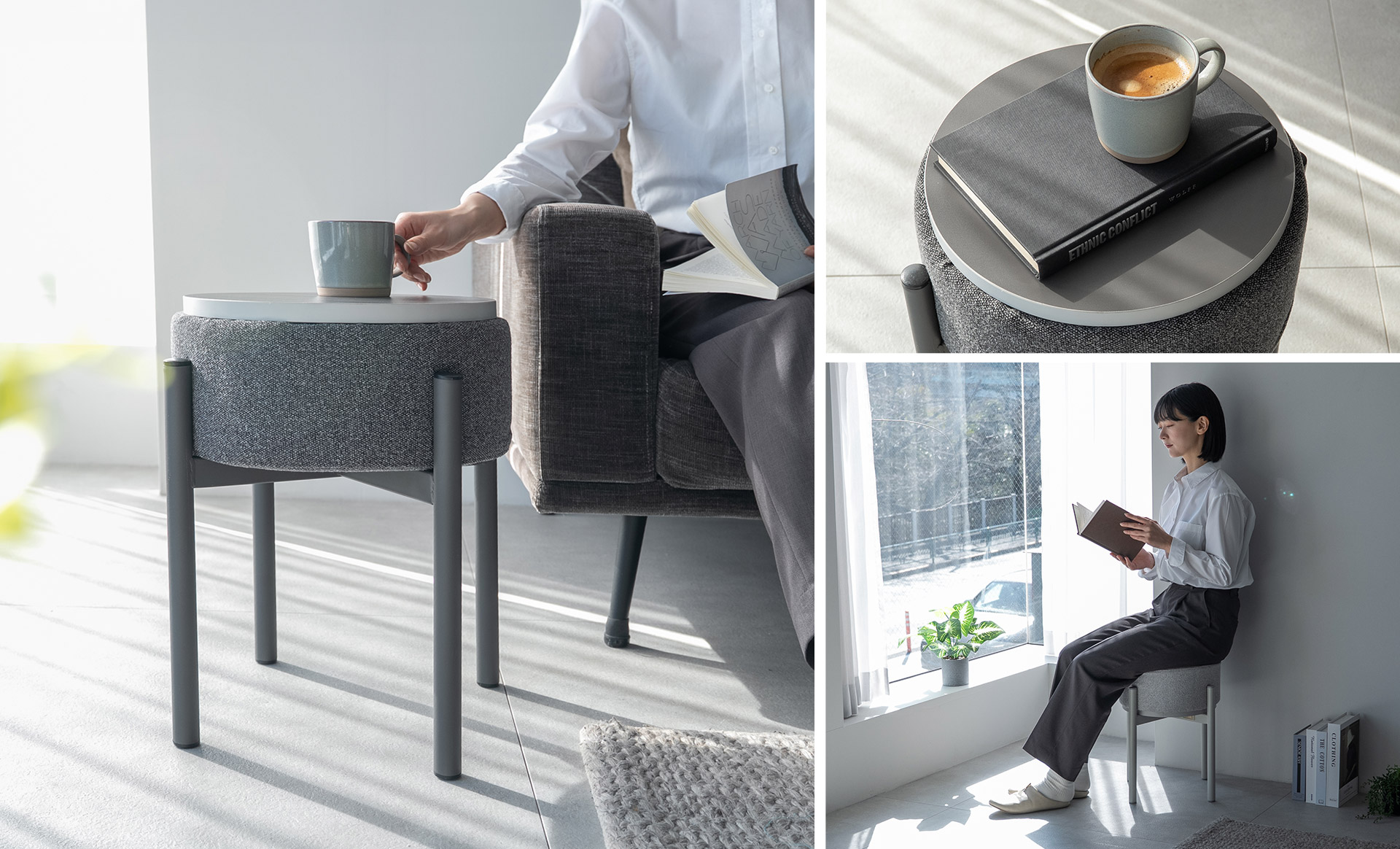 座る家具が、置く家具に変わる。シンプルな動作で役割を切り替えられるスイッチ設計です。