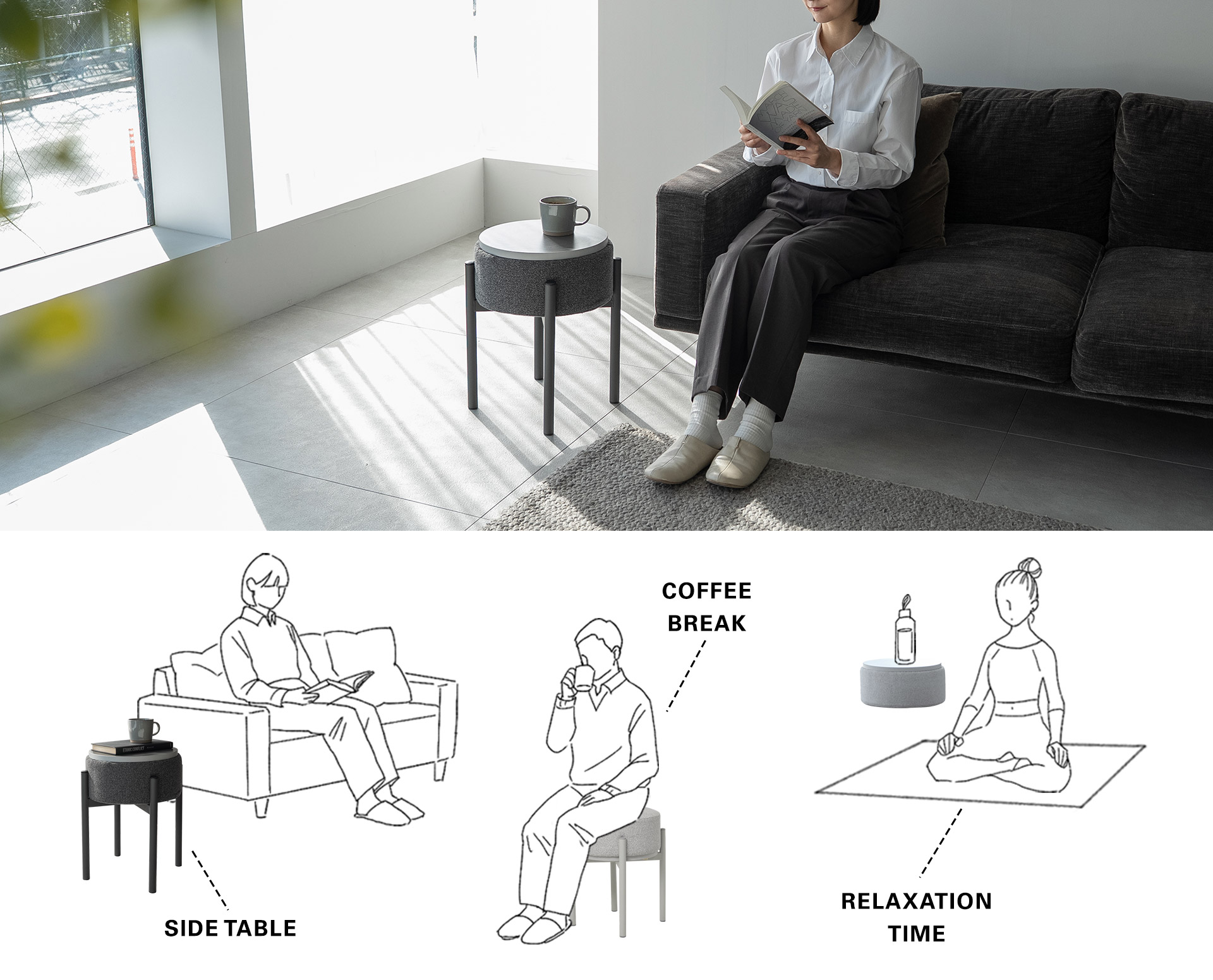 くつろぐ時間にも、コーヒーを楽しむ時間にも。ひとつの家具が、暮らしの場面に合わせて役割を変えます。
