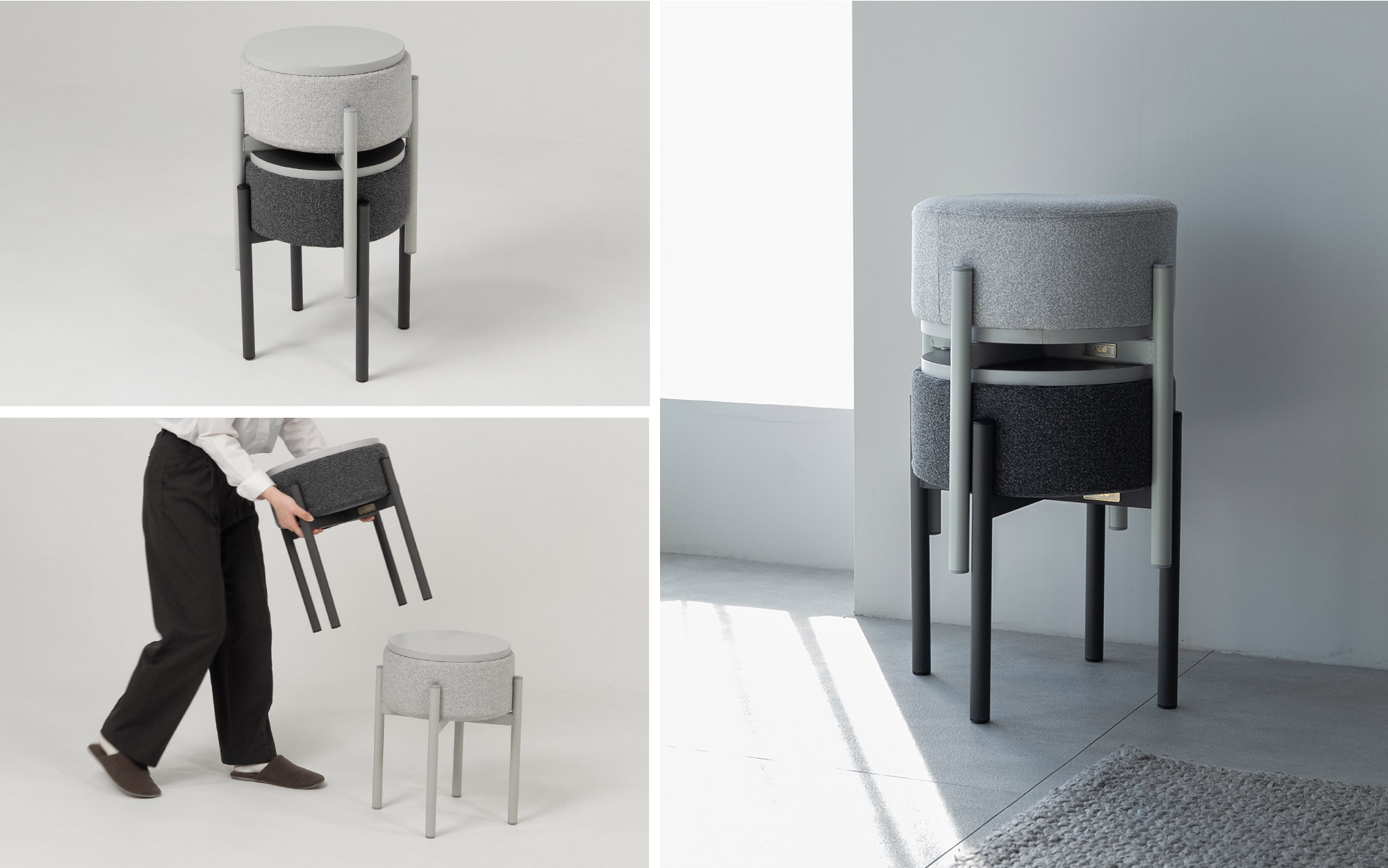 モーフィンは、座り心地の良いクッションスツールとしてはもちろん、裏返すとフラットな天板になり、サイドテーブルとしても使えるスイッチ設計。また、複数を重ねて収納できるスタッキングにも対応。暮らしのシーンに合わせて役割を切り替えることができる、TATAMU®シリーズの発想から生まれた多機能スツールです。