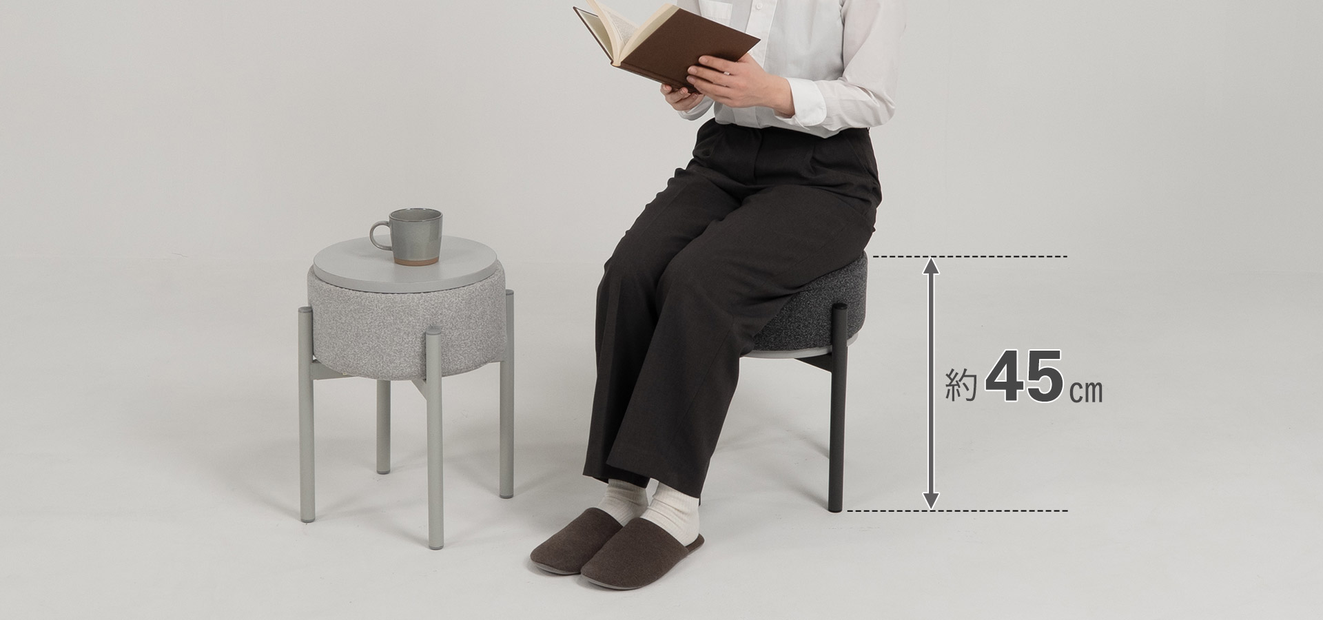 座面高は約45cm。ダイニングチェアより少し高めで、立ち座りがしやすい高さ。リビングだけでなく、玄関やキッチン、寝室など様々な場面で活躍します。