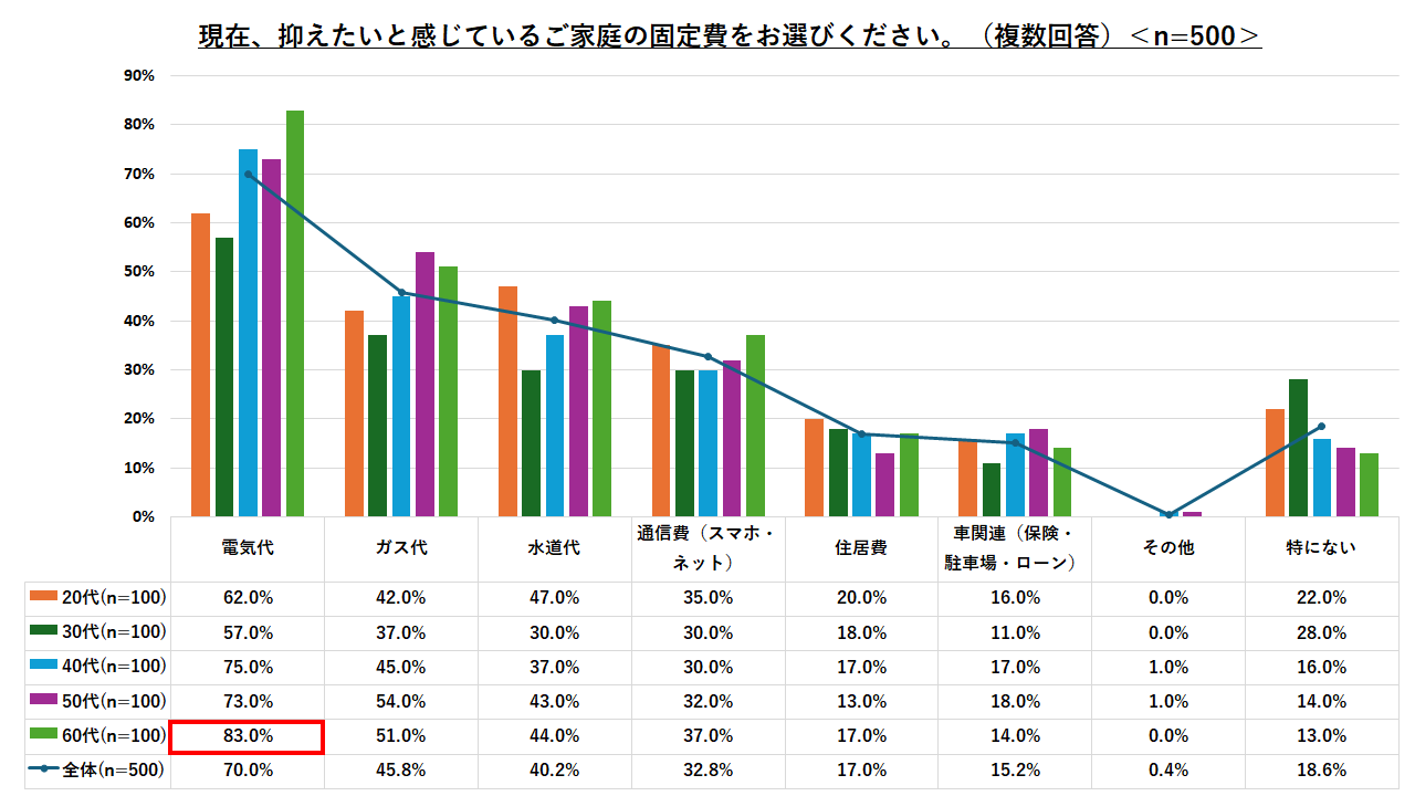 現在抑えたい固定費を聞いたところ、第1位は「電気代(70.0%)」となり、次点のガス代(45.8%)を大きく引き離しました。電気代への強い不安があることがうかがえます。特に60代は83.0%が電気代を削減したいと考えており、意識が高いことがわかりました。