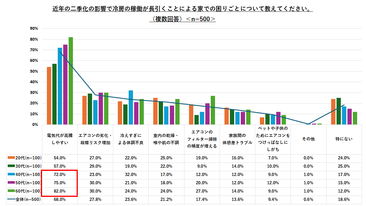 また、近年、春と秋が短く夏が長引く「二季化」の影響で冷房の稼働が長引くことによる家での困りごとを聞くと、「電気代が高騰しやすい」(68.0%)がトップとなりました。40代以降は7割を超え、特に60代では8割を超える人が電気代の高騰について触れています。また、「エアコンの劣化・故障リスク増加」(27.8%)が次に回答割合が高く、エアコンの稼働が長時間になることから、エアコンの劣化・故障への不安を抱いている人も多いようです。