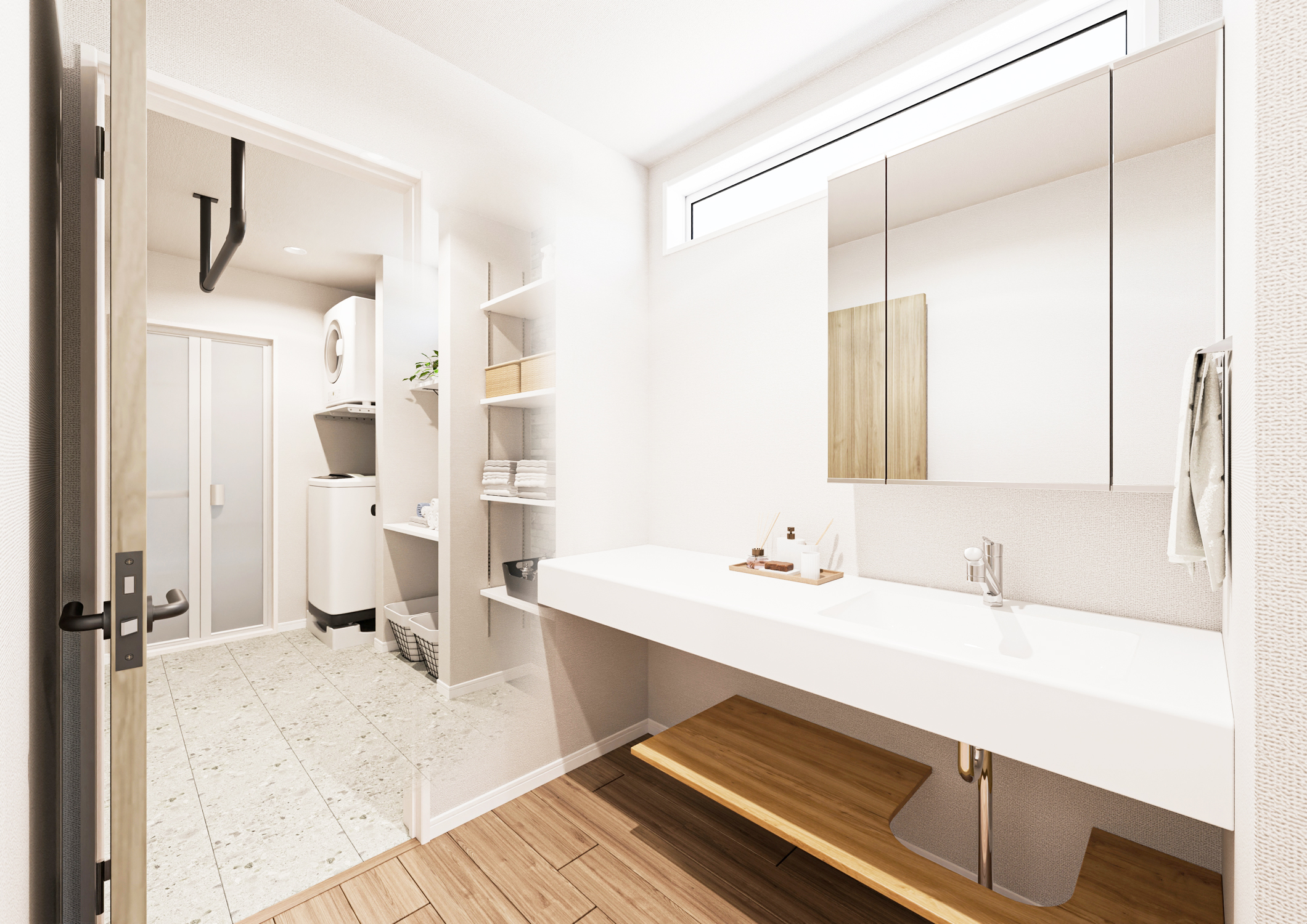 • 洗・脱分離の動線設計。朝の身支度と家事が交錯しない