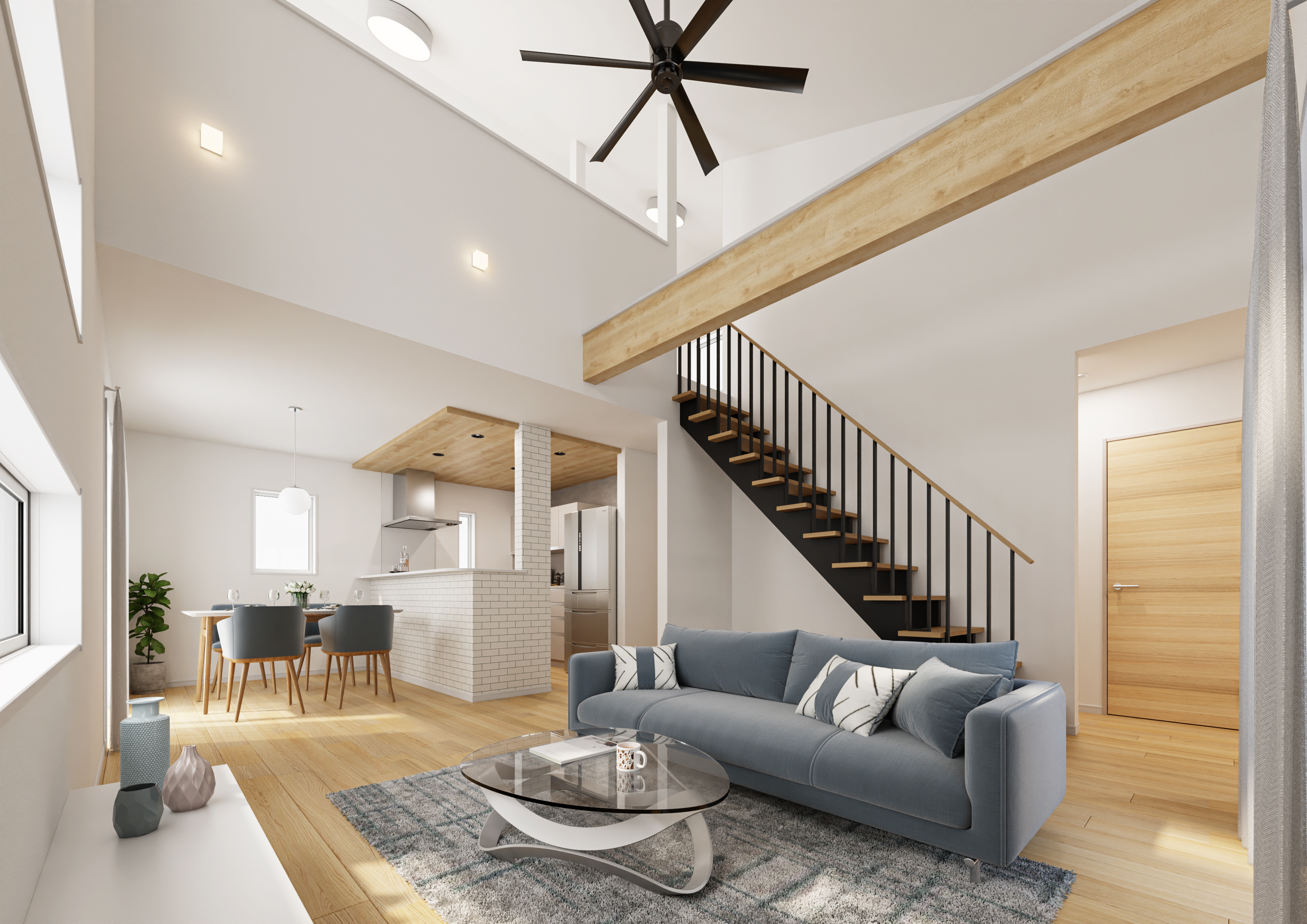 ウェルカムポーチから玄関・リビング・廊下の洗面化粧台、そしてスケルトン階段と勾配天井を介して2階(小屋裏空間)まで、視線と空間が連続する一体感のある住まい。どこにいても家族の気配を感じられる、開放的な暮らしをご提供します。