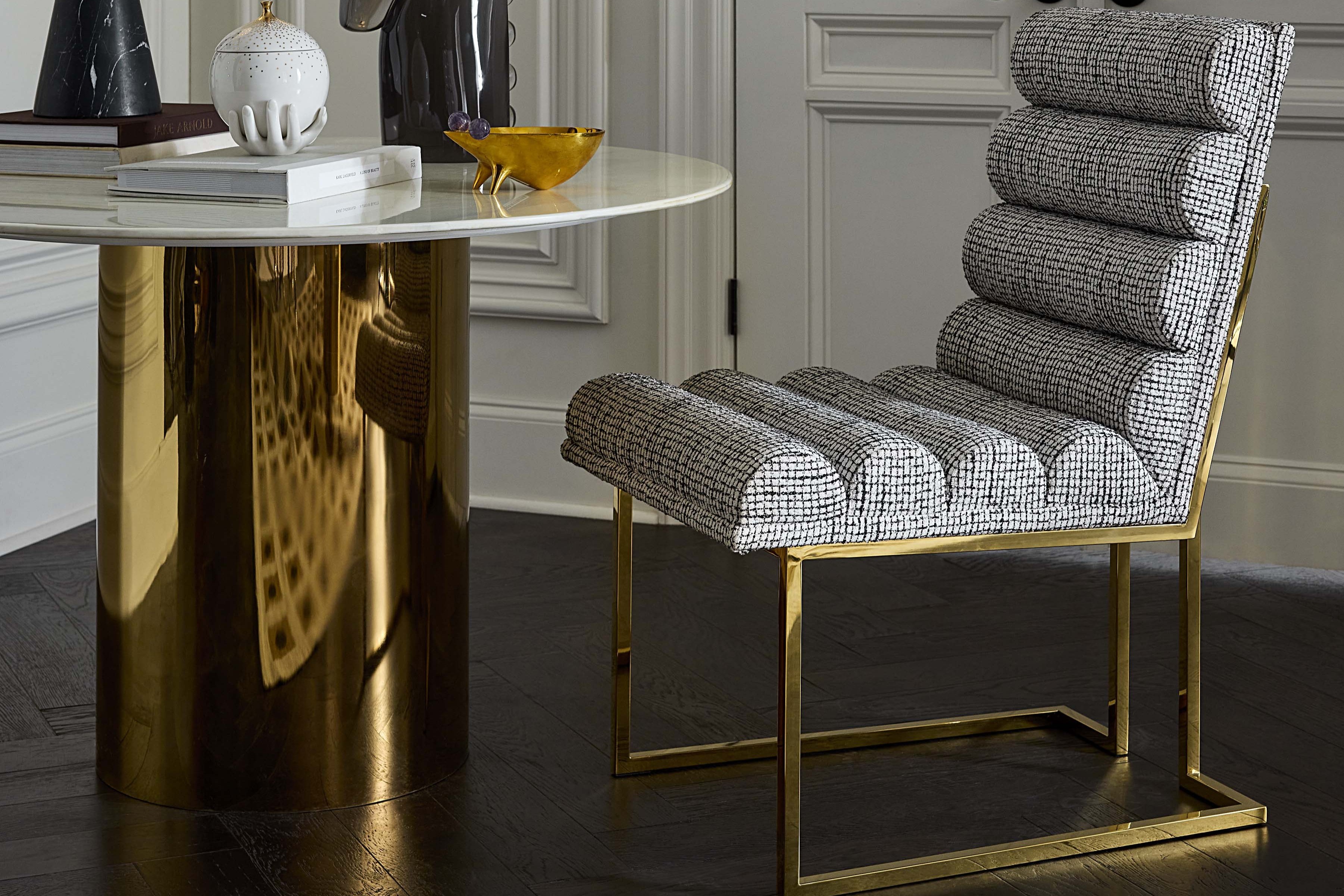 製品名:チャネルドゴールドフィンガーダイニングチェア 製品価格:385,000円(税込) 製品サイズ:W55×D73×H93(SH49)cm 製品素材:ポリエステル・ヴィスコース・ブラス |