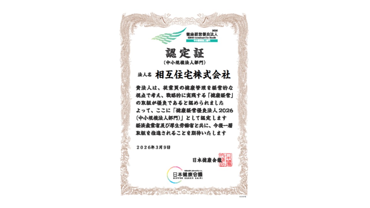 第一ライフ丸紅リアルエステート傘下の相互住宅株式会社(本社:東京都品川区、代表:武富正夫)は、2026年3月9日付で「健康経営優良法人2026(中小規模法人部門)」に認定されました。