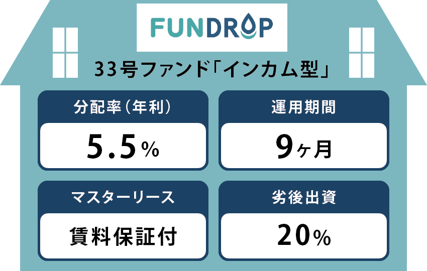 FUNDROP 33号ファンドは、利回り(年利)5.5%、賃料保証付きにて運用