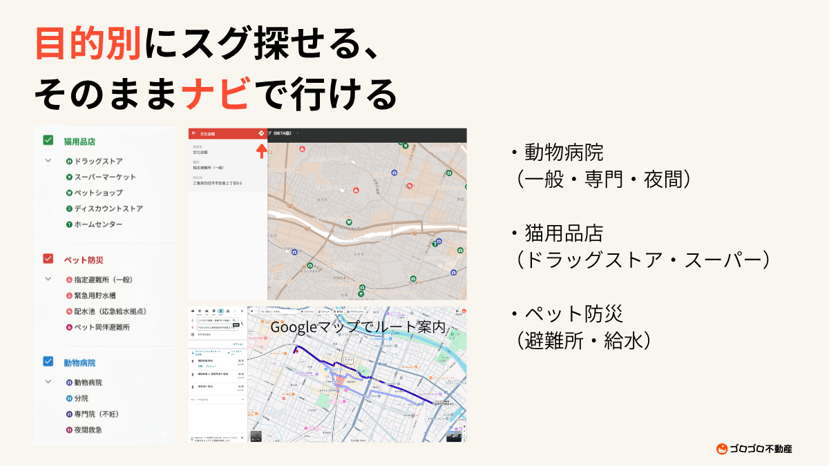 動物病院・猫用品店・ペット防災情報まで一目で確認できます。