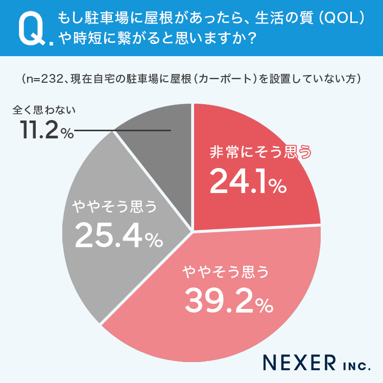 カーポート未設置の方に、もし駐車場に屋根があったら、生活の質(QOL)や時短に繋がると思うか聞いてみました。
