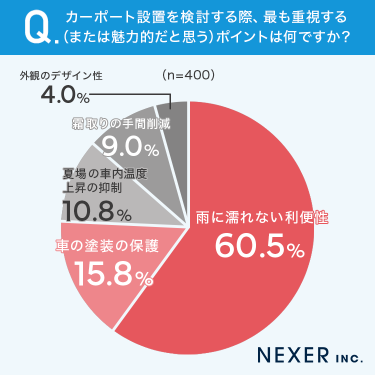 最後に、カーポート設置を検討する際に最も重視する(または魅力的だと思う)ポイントを聞いてみました。