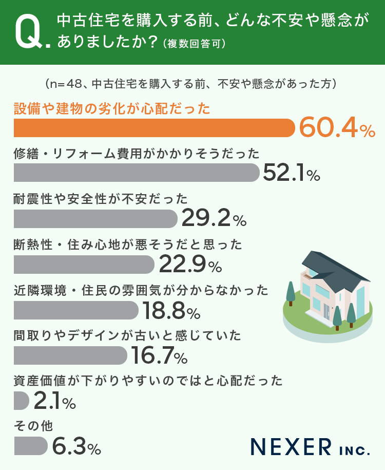 さらに「耐震性や安全性が不安だった」が29.2%、「断熱性・住み心地が悪そうだと思った」が22.9%、「近隣環境・住民の雰囲気が分からなかった」が18.8%、「間取りやデザインが古いと感じていた」が16.7%という結果になりました。